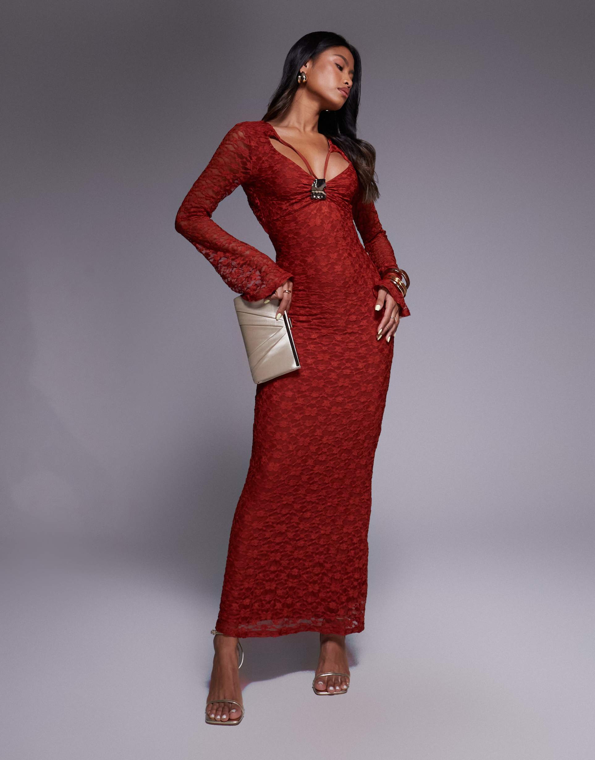 ASOS DESIGN LACE ANGEL SLEEVES MAXI DRESS WITH FRONT CUT OUT IN RED