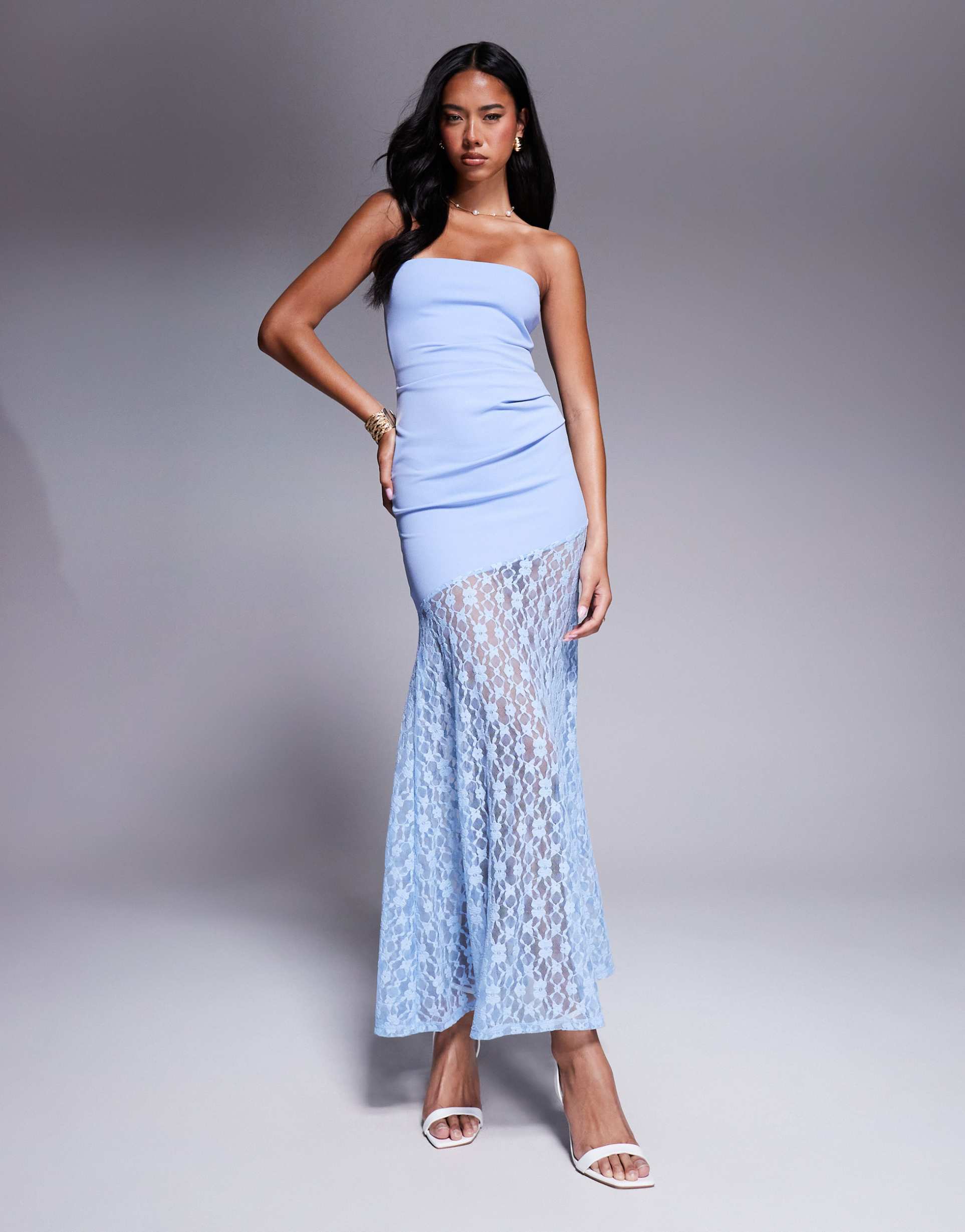 ASOS DESIGN LACE BANDEAU MAXI DRESS WITH SCARF NECK DETAIL IN BLUE