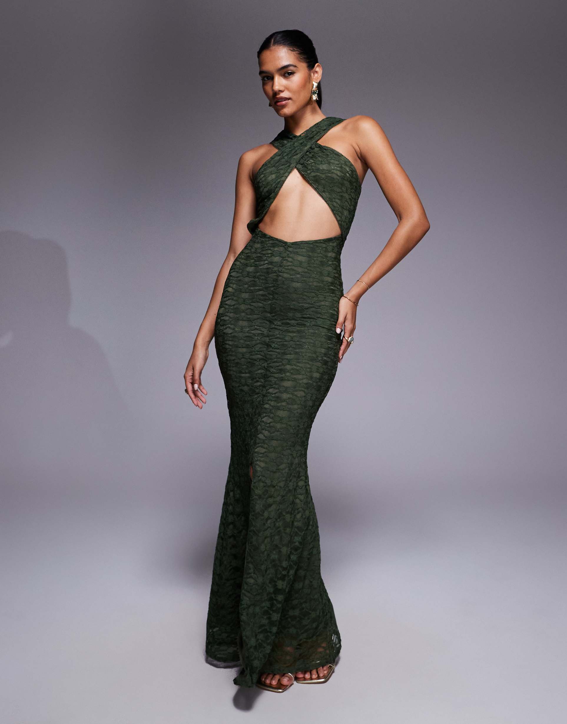 ASOS DESIGN LACE CROSS FRONT HALTER MAXI DRESS WITH CENTER CUT-OUT IN KHAKI