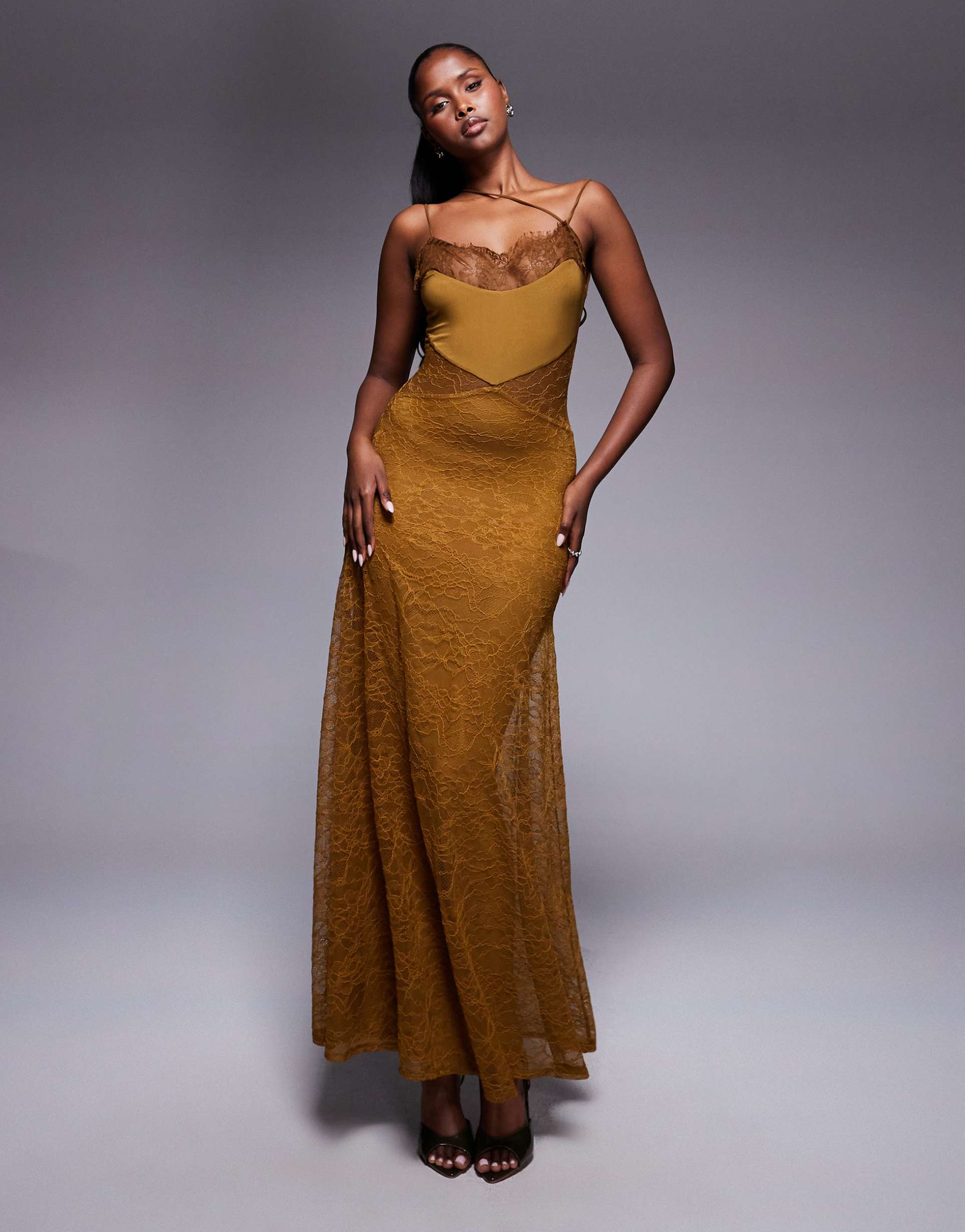 ASOS DESIGN LACE MAXI DRESS WITH ASYMMETRIC STRAPPING IN BRONZE