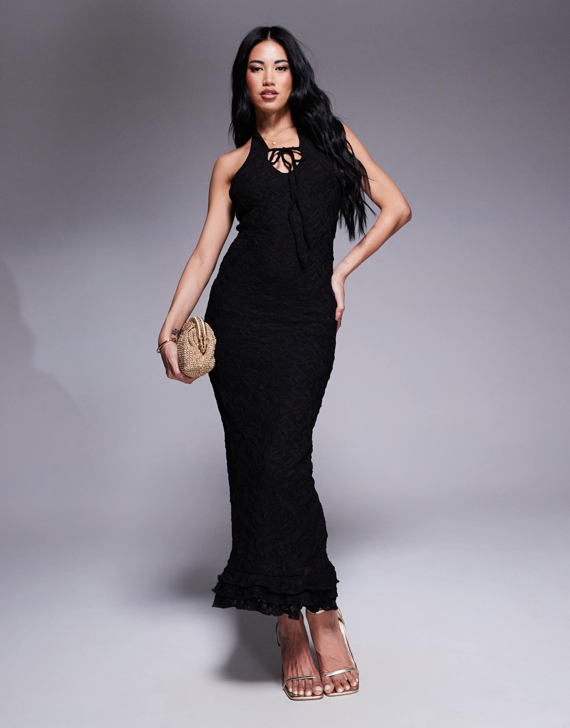 Delicate black lace forms a sophisticated column silhouette in this halterneck maxi dress, featuring a flattering regular fit and sleeveless styling. The open back adds a sultry touch, while the ruffled hemline introduces playful movement and texture. Crafted from lace with polyester lining and elastane for comfort, this dress balances elegance with a hint of sexiness. Ideal for cocktail parties, date nights, or evening events, it effortlessly elevates your wardrobe with timeless charm and modern flair.