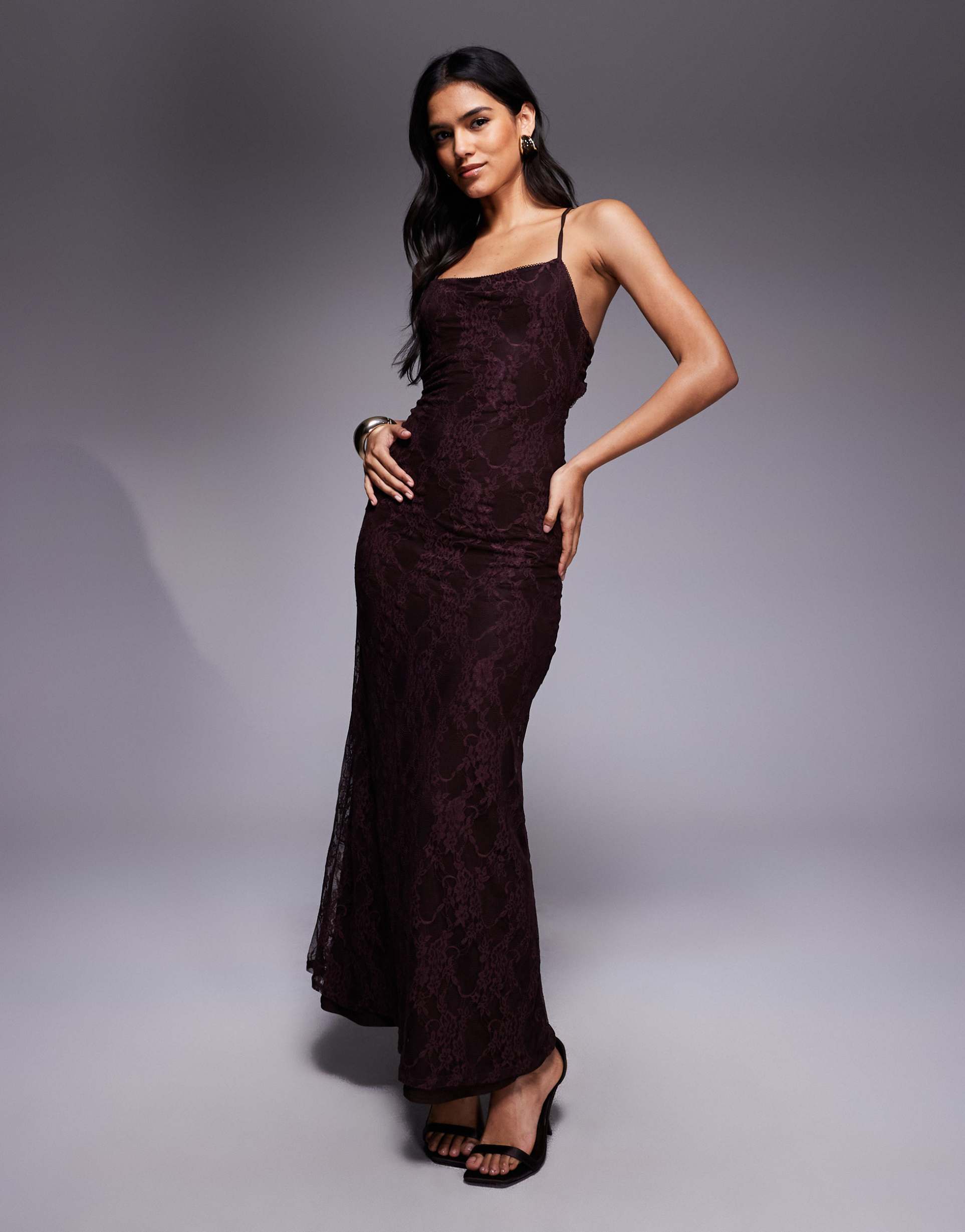 ASOS DESIGN LACE SQUARE NECK CAMI MAXI DRESS WITH TIE BACK IN CHOCOLATE