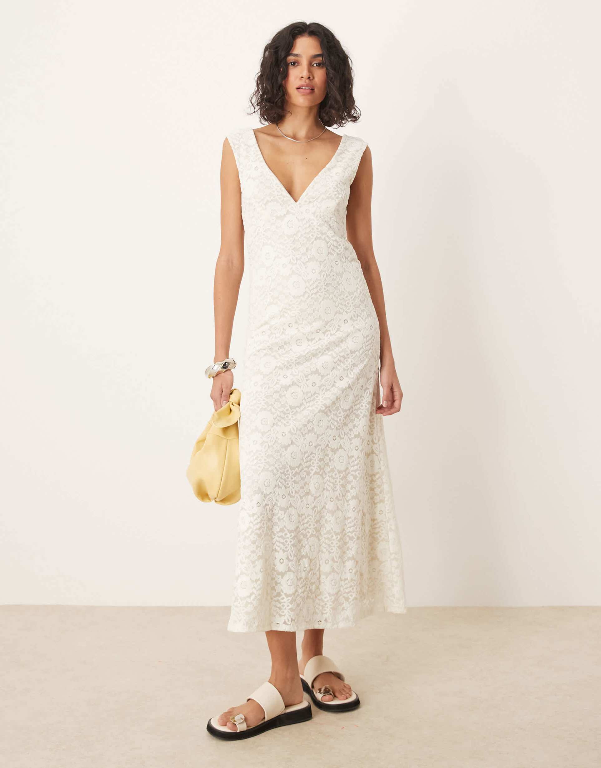 ASOS DESIGN LACE V FRONT MIDI DRESS WITH FRILL HEM IN WHITE
