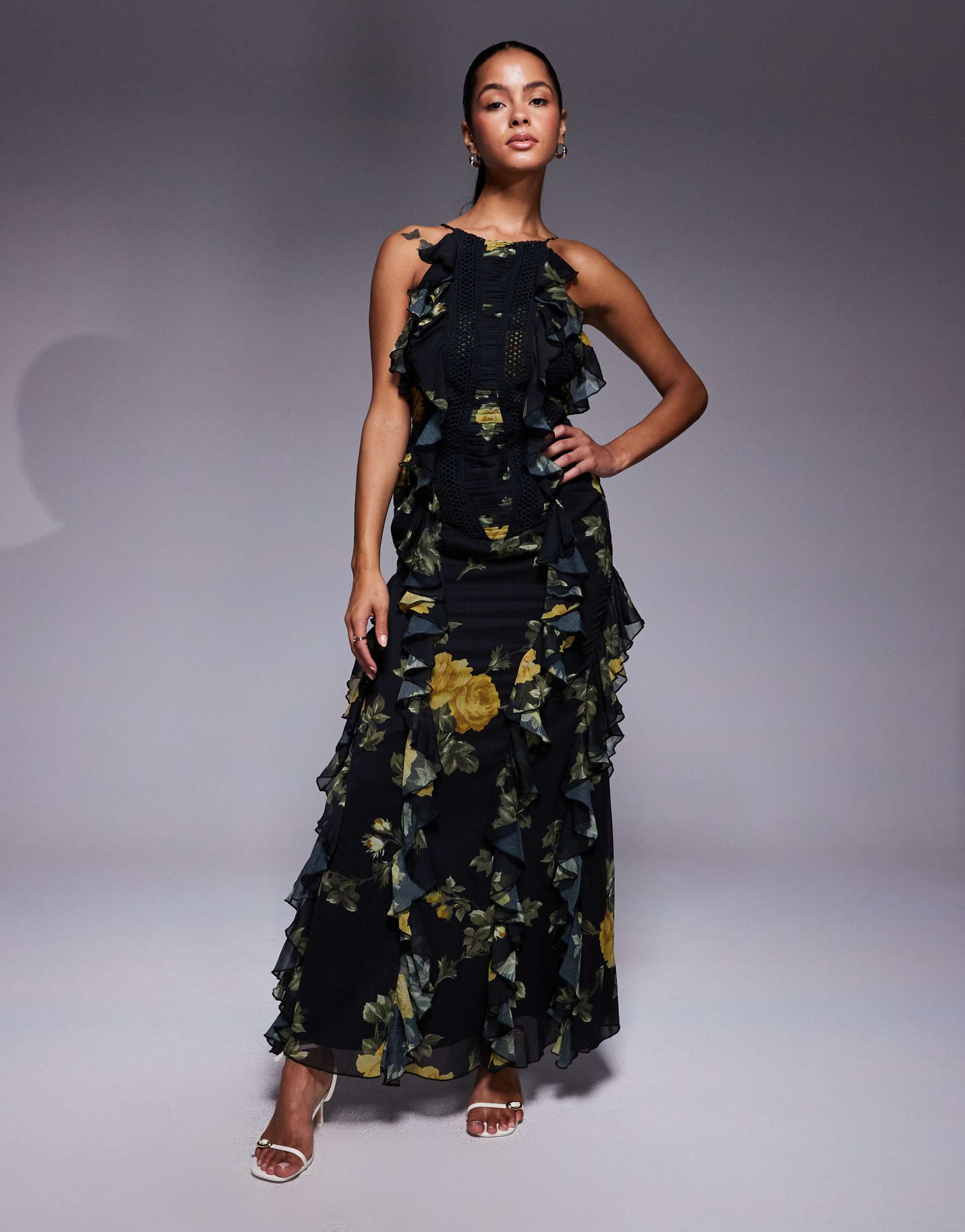Embrace sun-soaked days and effortless romance in this ASOS DESIGN ladder trim ruffle maxi. A halter-neck silhouette ties gracefully at the neck, revealing just enough skin while the floor-skimming hem sways with every step. Crafted in a polyester shell with a soft lining, the bold floral print bursts against a deep black backdrop, featuring oversized yellow blooms and fresh green foliage. The bodice is slim and flattering, easing into a fluid, layered maxi that moves with you. Dress up with sandals and a clutch for evening events, or keep it chic for daytime vacations and garden parties. Timeless, versatile, unforgettable.