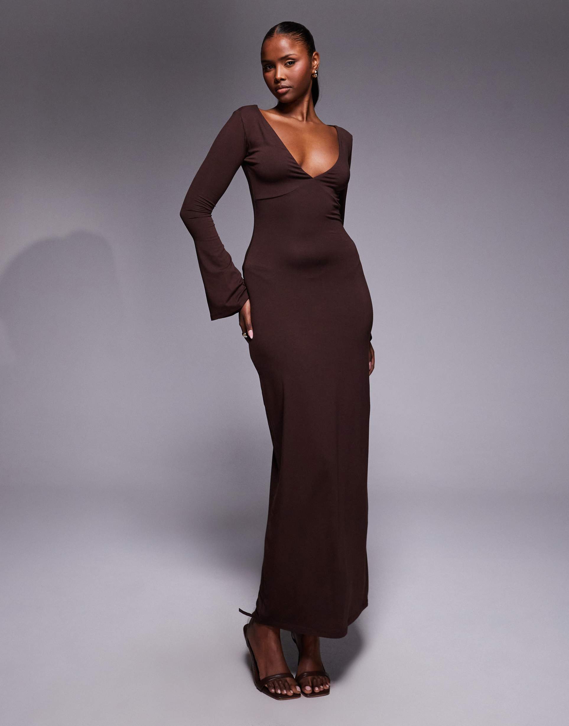 ASOS DESIGN LONG ANGEL SLEEVE SHOULDER GRAZER MIDI DRESS IN CHOCOLATE