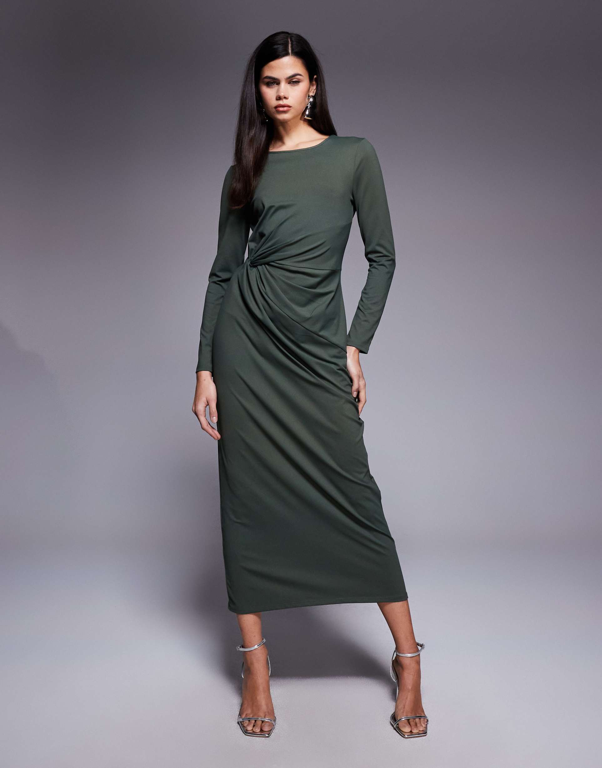 ASOS DESIGN LONG SLEEVE ASYMMETRIC NECK TWIST SIDE MIDI DRESS IN KHAKI