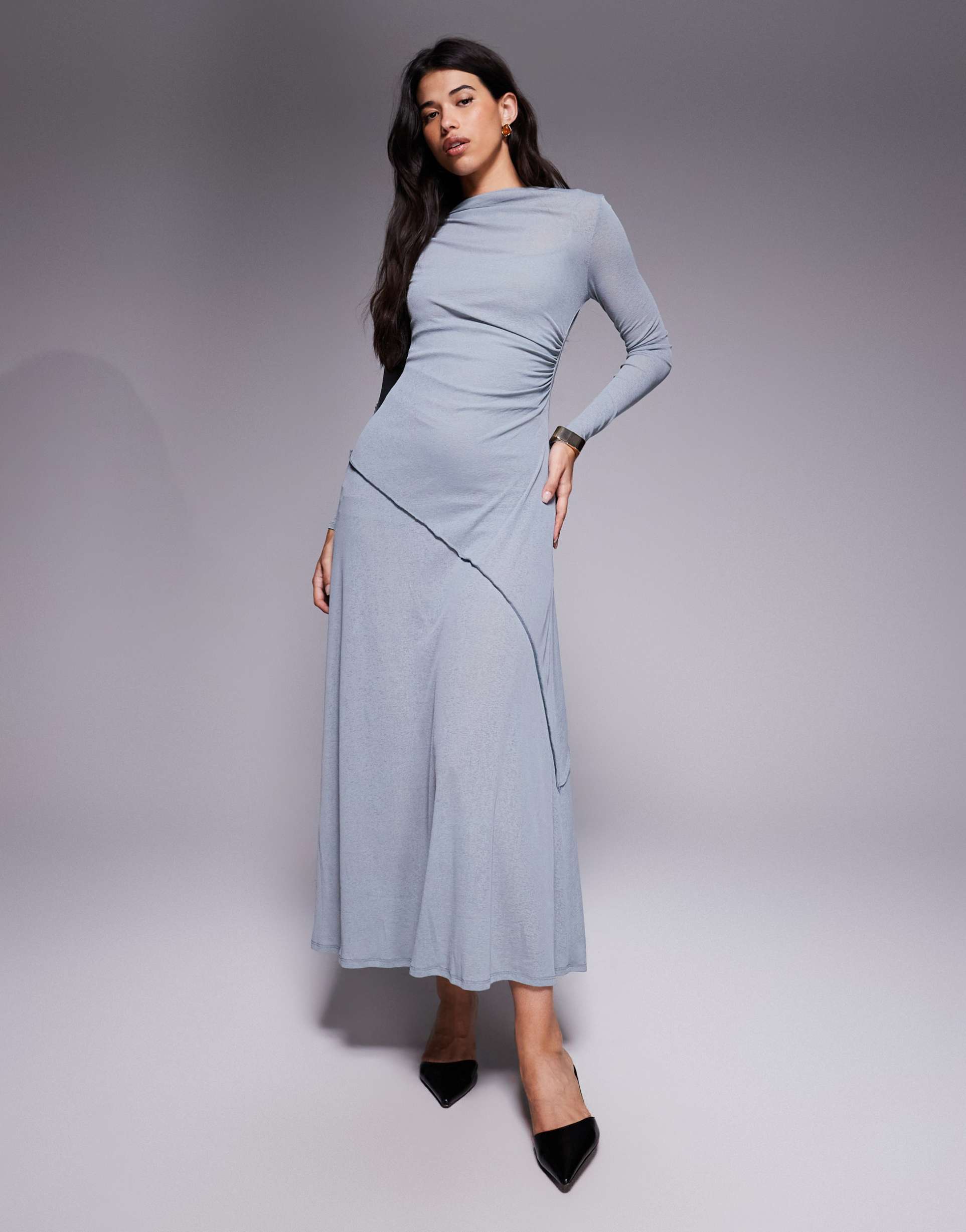 ASOS DESIGN LONG SLEEVE DRAPE DETAIL MAXI DRESS IN GRAY