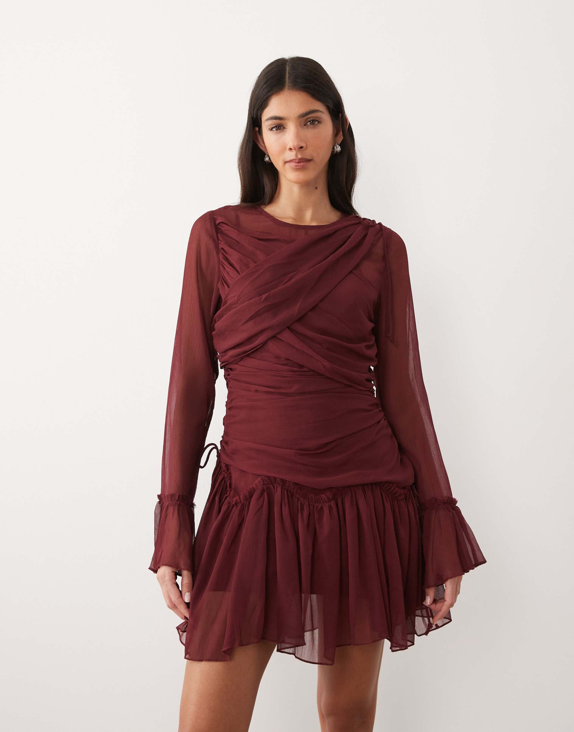 ASOS DESIGN LONG SLEEVE DRAPED FRILL MINI DRESS IN BURGUNDY