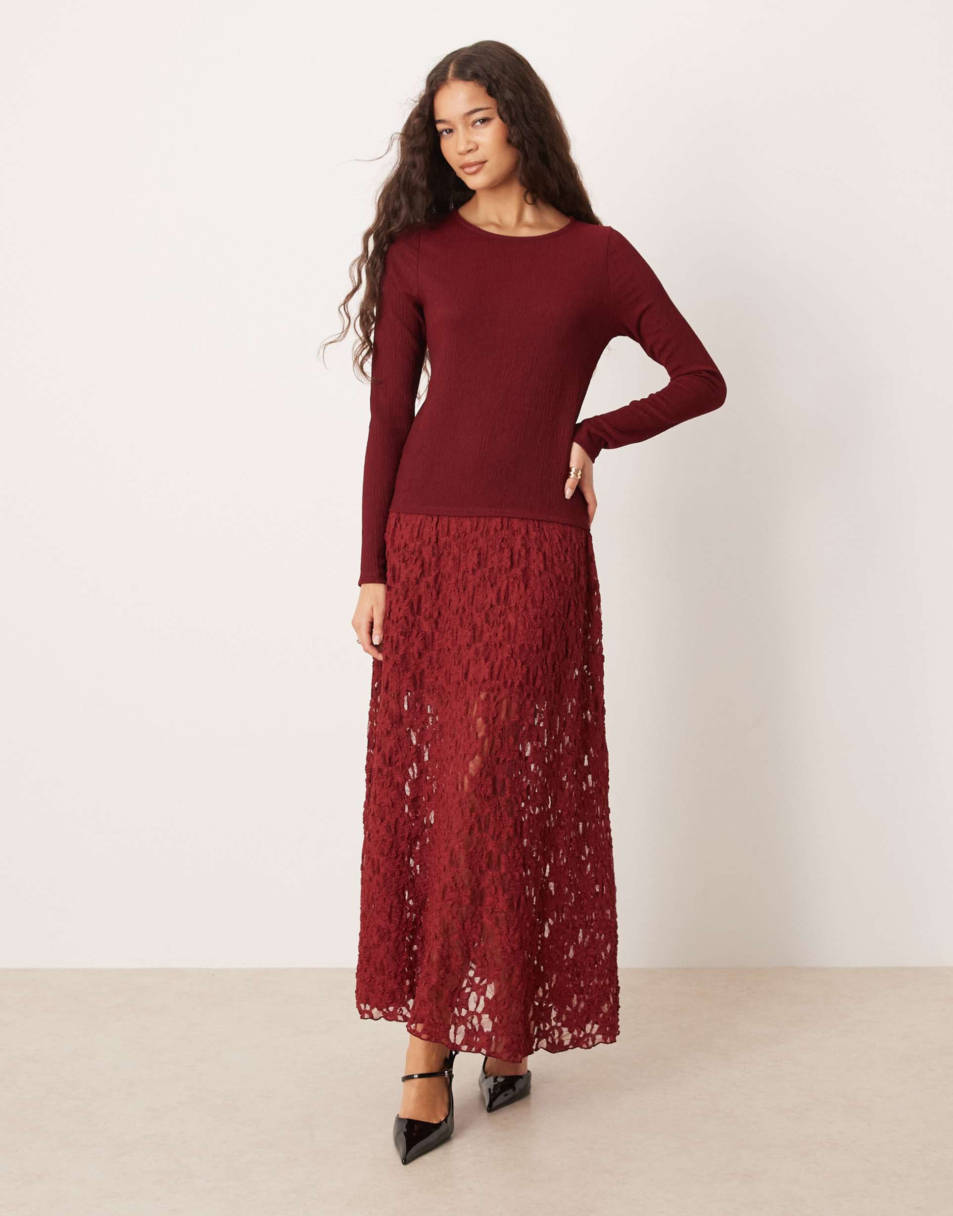 ASOS DESIGN LONG SLEEVE DROPPED WAIST LACE SKIRTED MIDI DRESS IN BURGUNDY