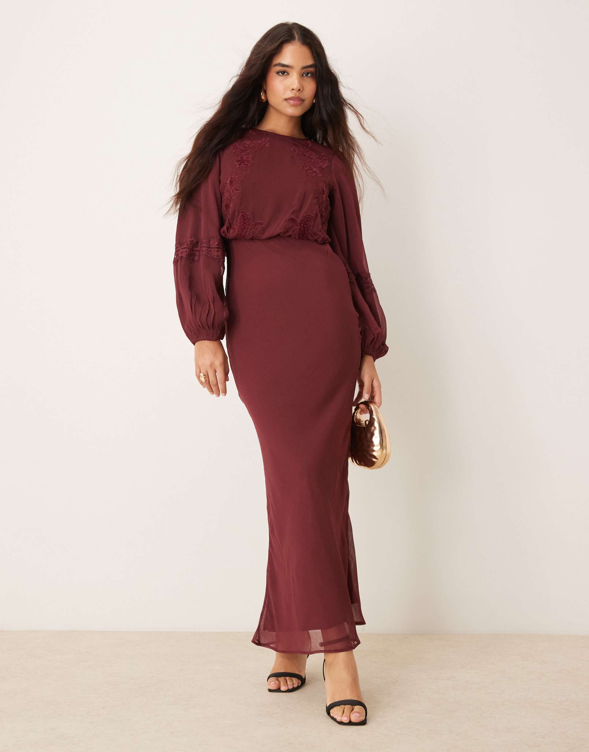 Soft chiffon in a rich matte burgundy hue shapes this elegant column maxi dress, featuring a classic crew neckline and romantic balloon long sleeves. Delicate floral embroidery embellishes the bodice and sleeves, adding subtle texture and charm to the regular fit silhouette. The sheer overlay and fitted waist create a graceful flow down to a clean hemline, perfect for autumn and winter events. Ideal for date nights, formal occasions, and cocktail parties, this dress blends timeless sophistication with lightweight comfort.