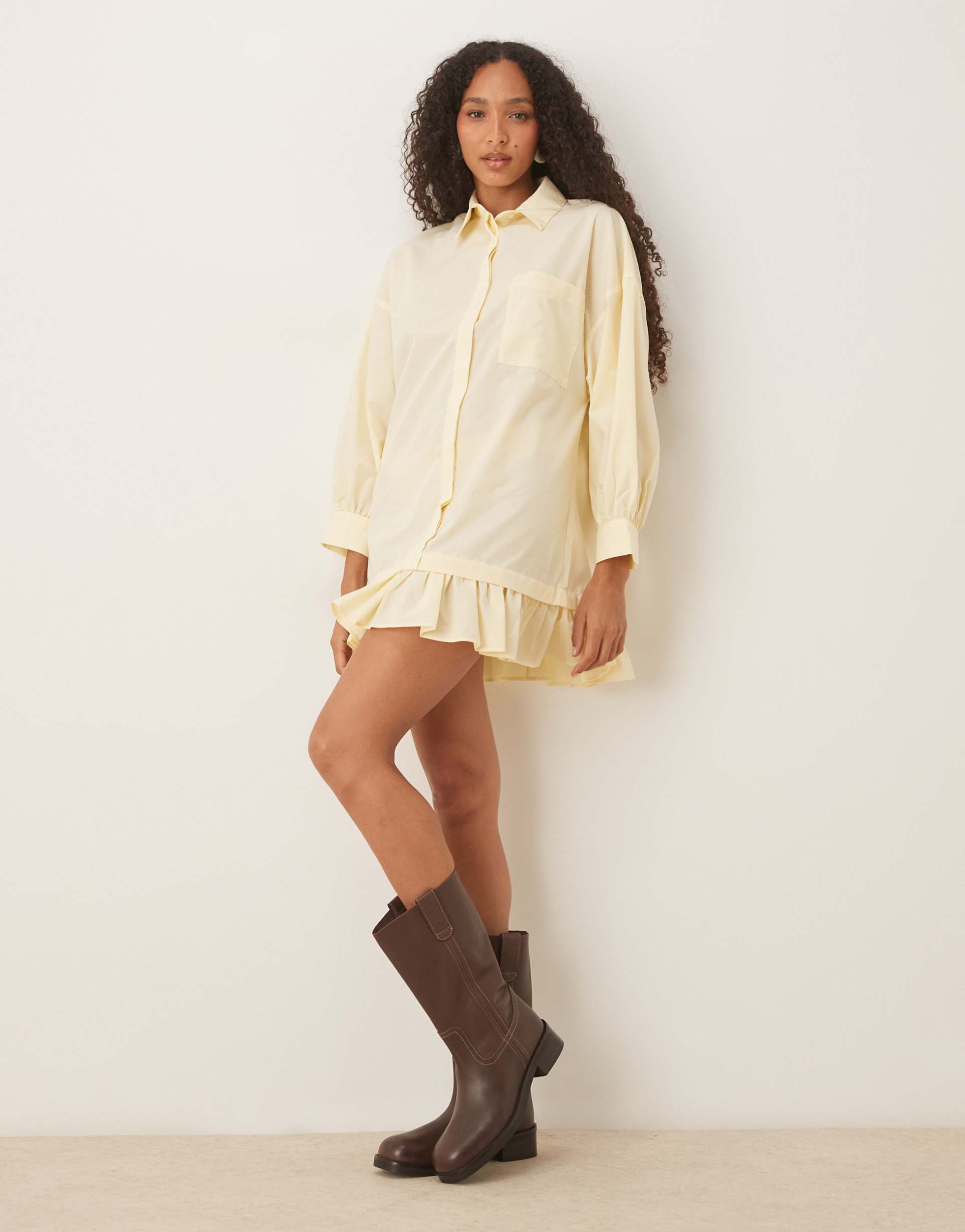 ASOS DESIGN LONG SLEEVE FRILL HEM MINI SHIRT DRESS IN BUTTERMILK
