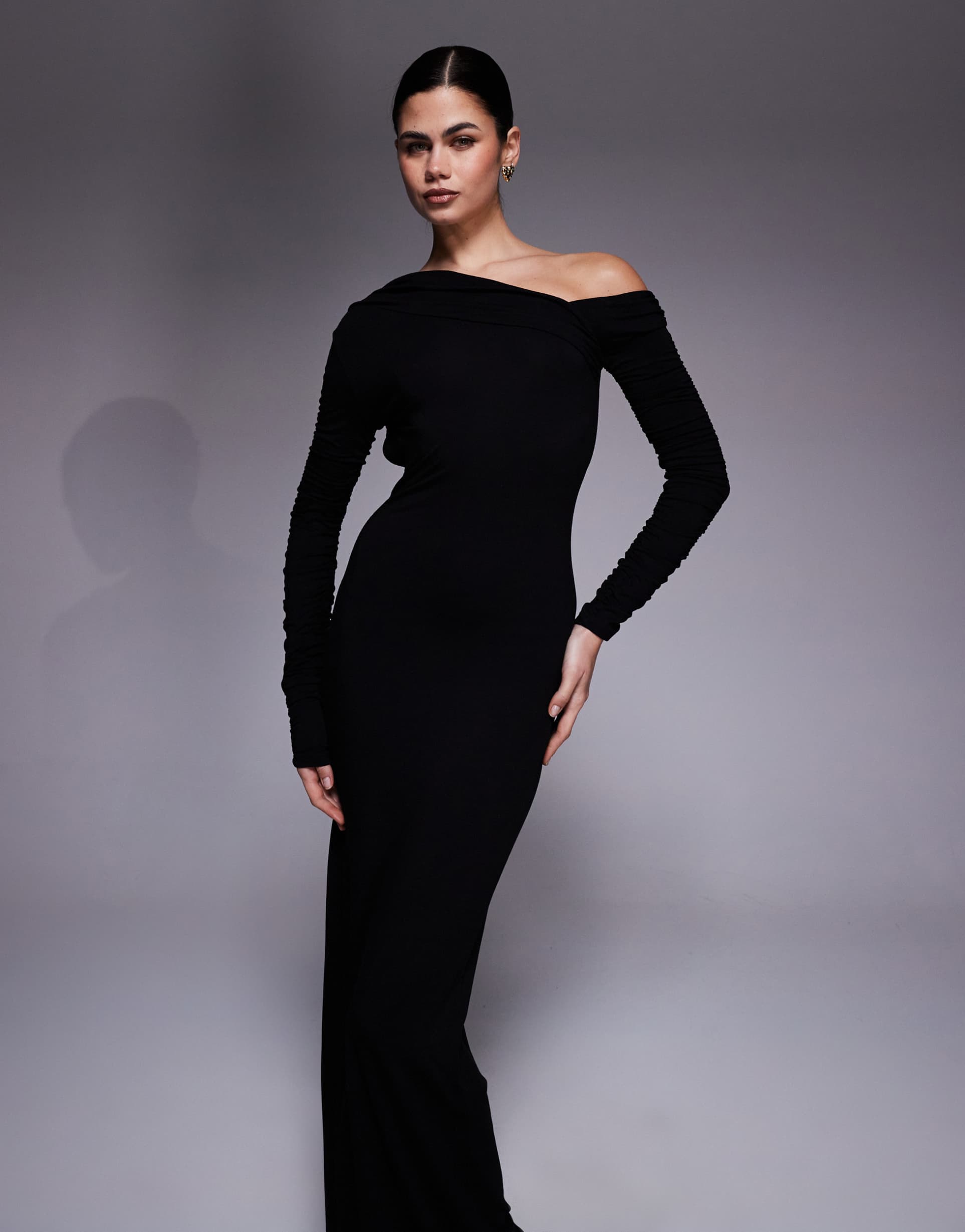 ASOS DESIGN LONG SLEEVE OFF-SHOULDER MAXI DRESS WITH ASYMMETRIC OPEN BACK IN BLACK