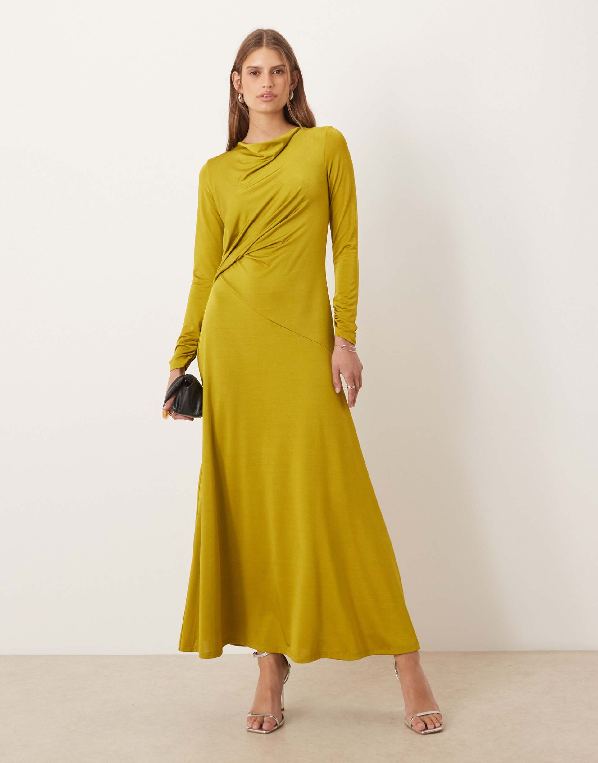 Soft jersey fabric and a matte mustard hue combine in this elegant maxi dress featuring a classic round neck and long regular sleeves. The column silhouette with a regular fit gently skims the body, while the front ruching detail adds subtle texture and visual interest. Its clean hemline enhances the minimalist aesthetic, making it a versatile choice for date nights, cocktail parties, or a stylish night out. The stretchy polyester and elastane blend ensures comfort and ease of movement throughout the seasons.