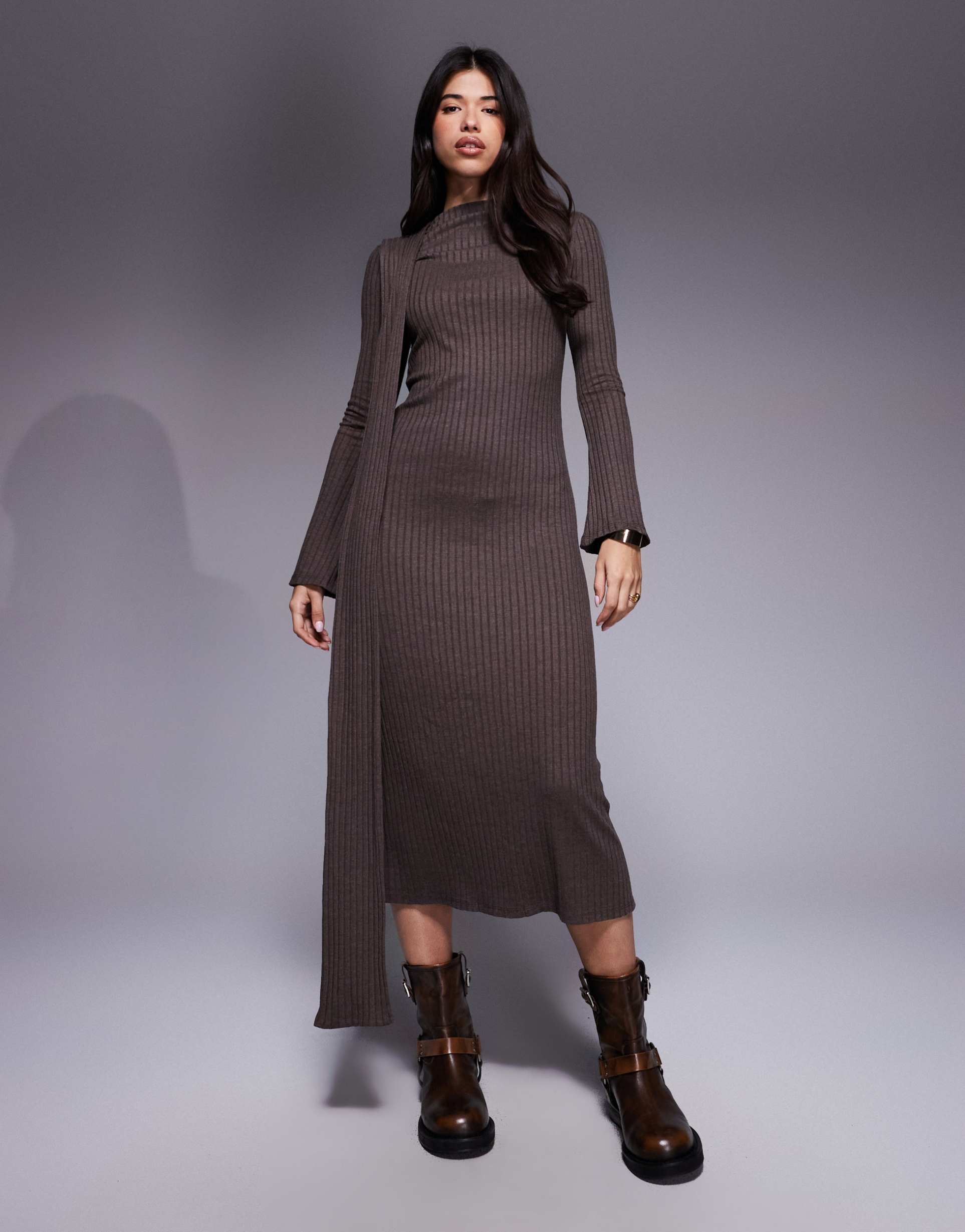 Soft ribbed knit fabric and a regular fit create a sleek silhouette with a high neck and long sleeves for cozy autumn and winter days. The chocolate matte hue enhances the minimalist sheath style, while the scarf detail draping adds subtle front interest. This maxi length dress pairs effortlessly with boots for casual outings, date nights, or workwear, blending warmth with understated elegance.