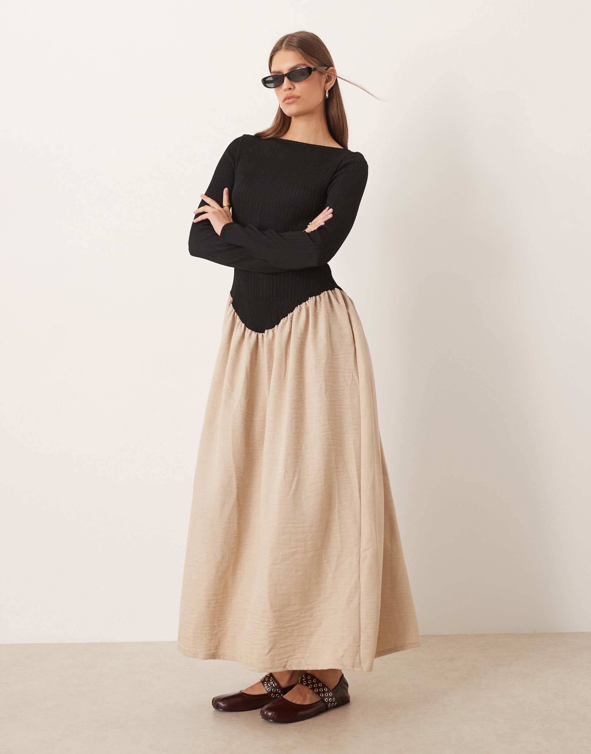 ASOS DESIGN LONG SLEEVE SLASH NECK DIPPED DROPPED WAIST MIDI DRESS IN BLACK AND BEIGE