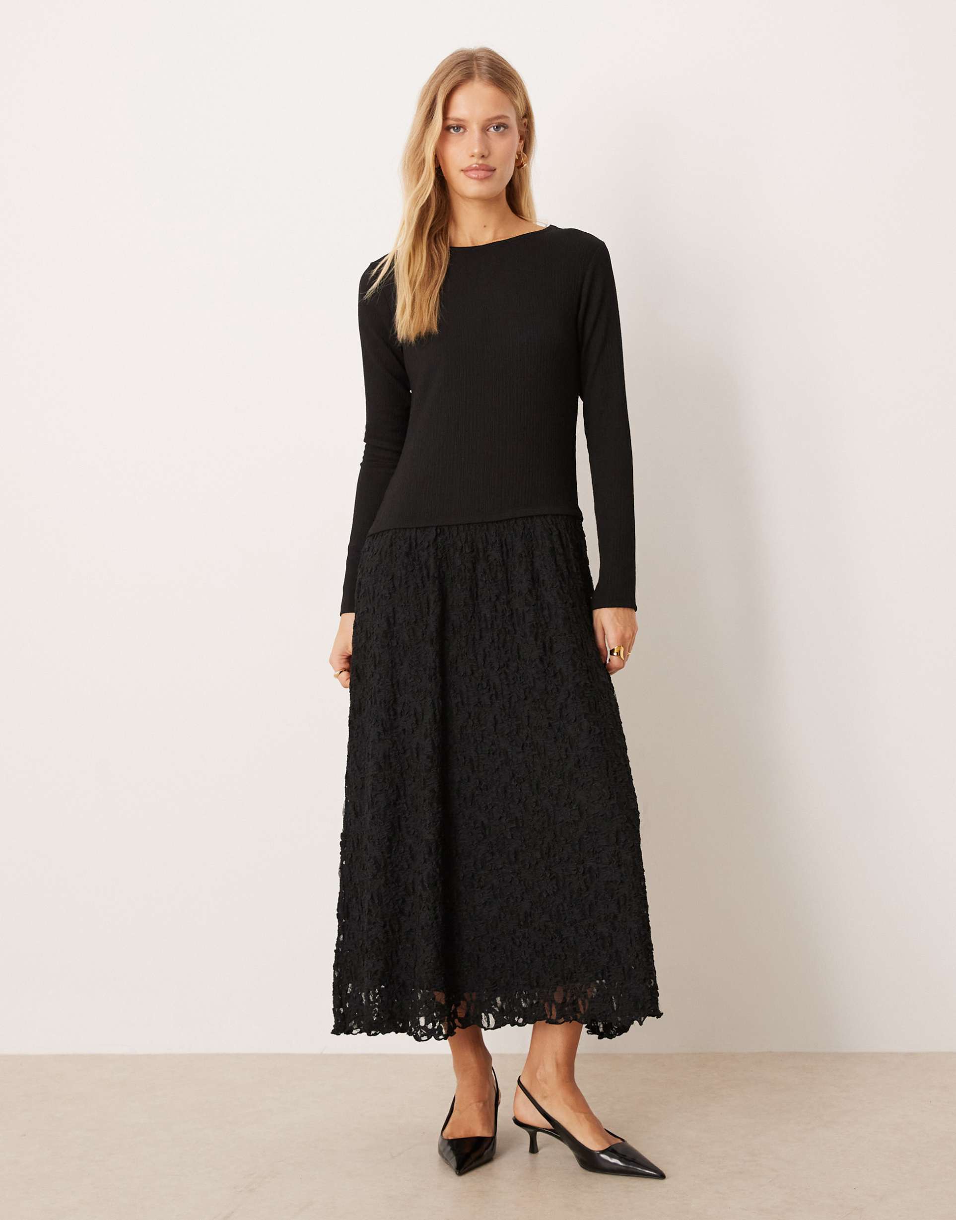 ASOS DESIGN LONG SLEEVE SLASH NECK LACE SKIRTED MIDI DRESS IN BLACK