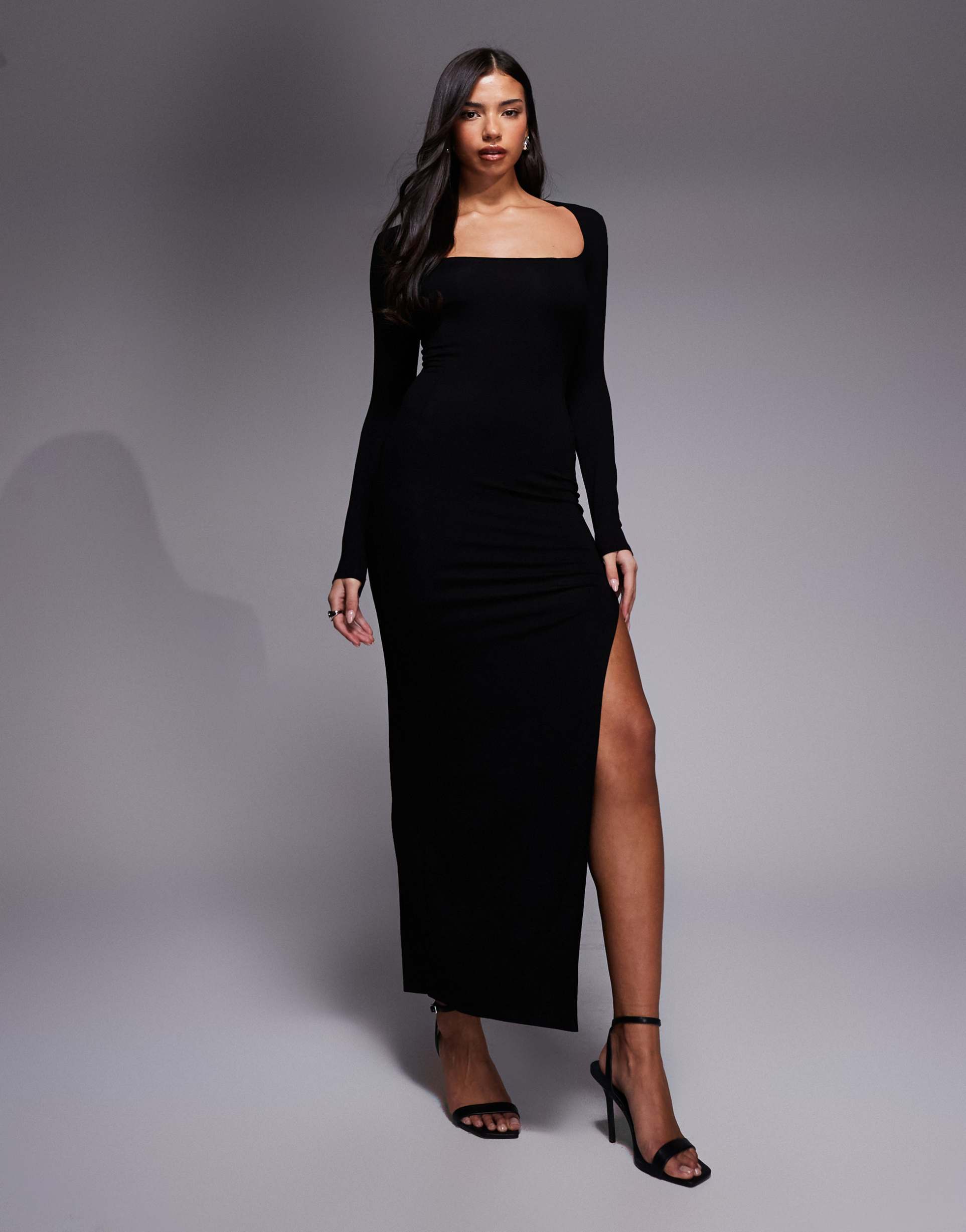 ASOS DESIGN LONG SLEEVE SUPER SCOOP NECK MAXI DRESS WITH SIDE SLIT IN BLACK