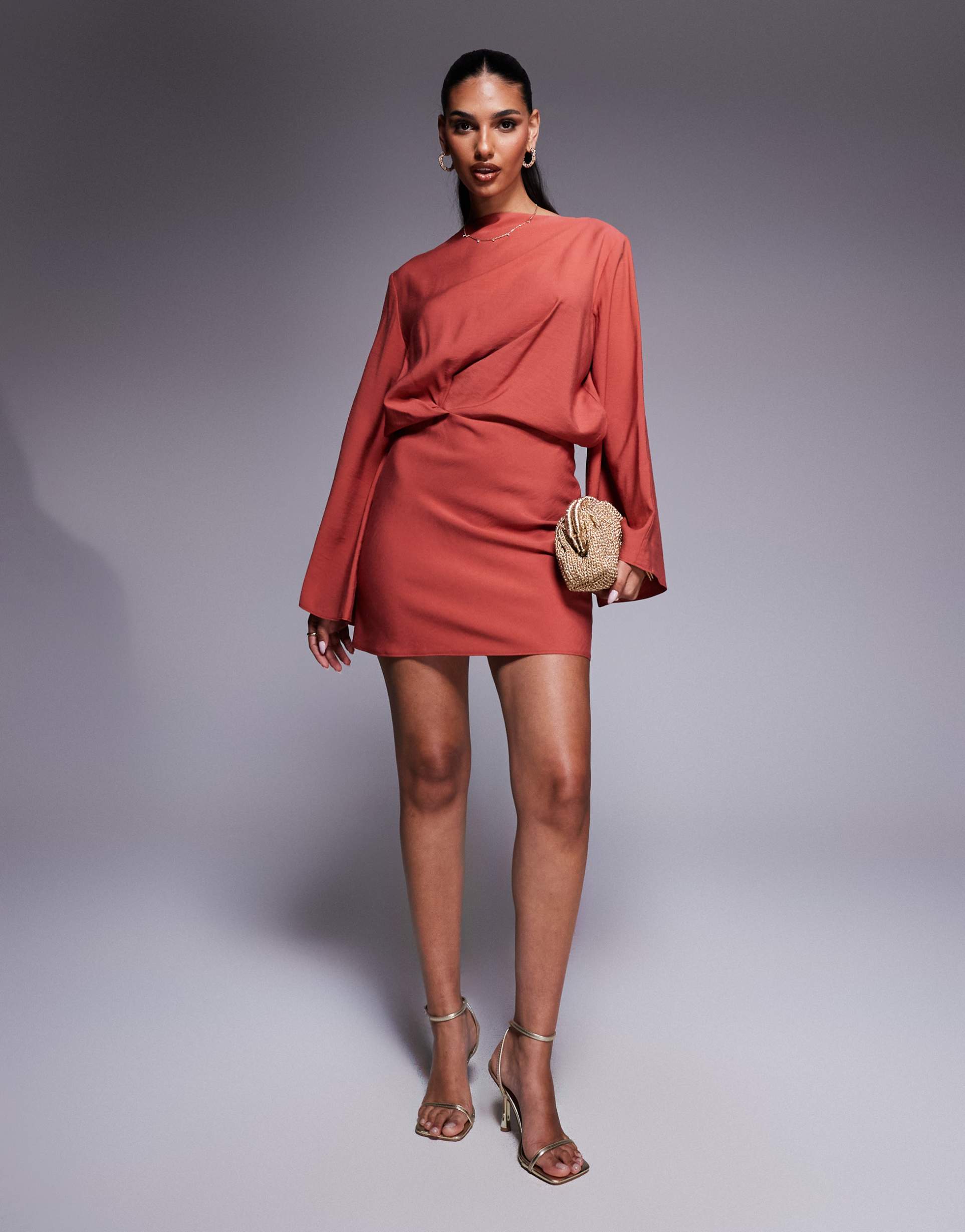 ASOS DESIGN LONG SLEEVE TUCKED WAIST BIAS CUT MINI DRESS IN RUST