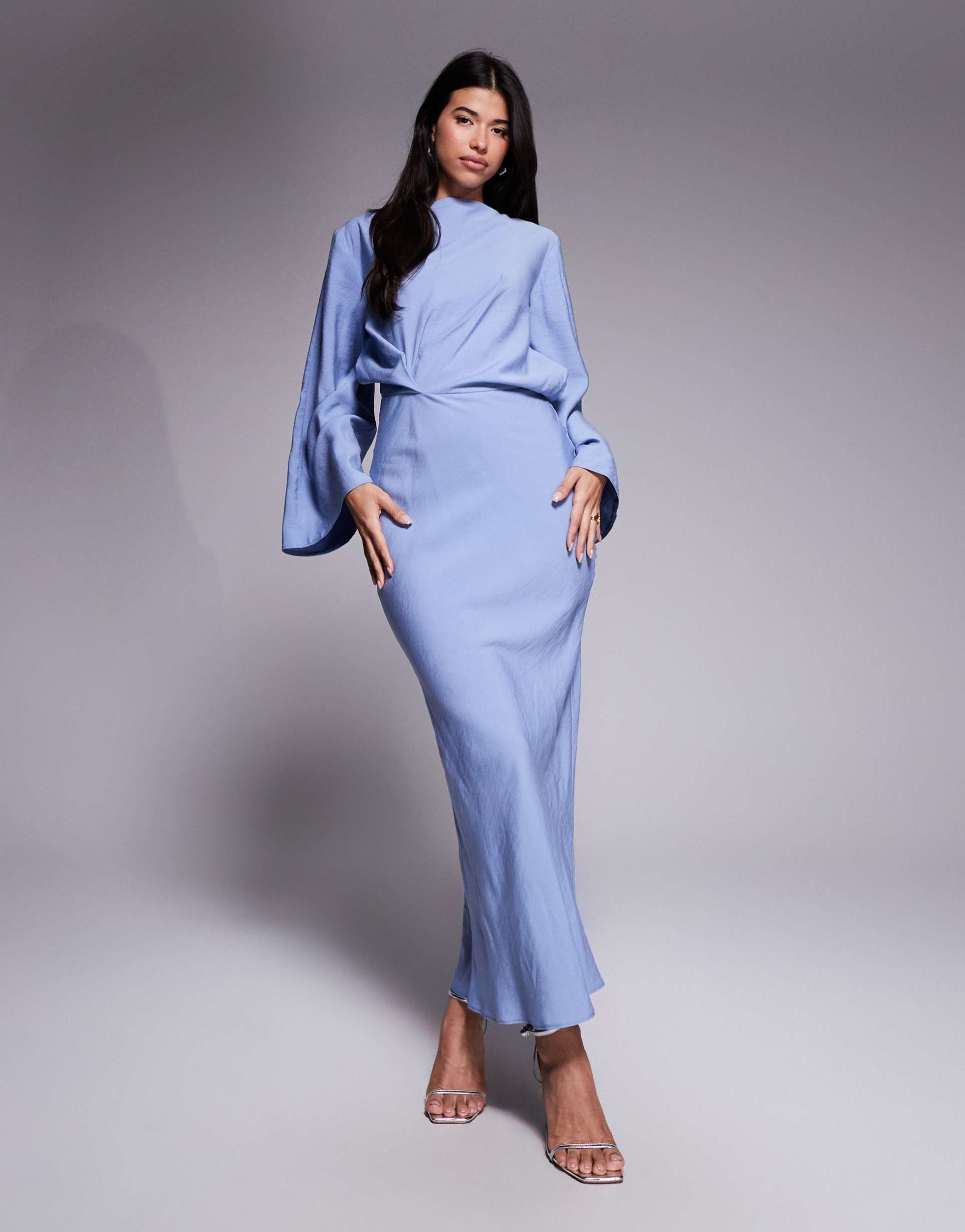 ASOS DESIGN LONG SLEEVE TUCKED WAIST BIAS MAXI DRESS IN BLUE