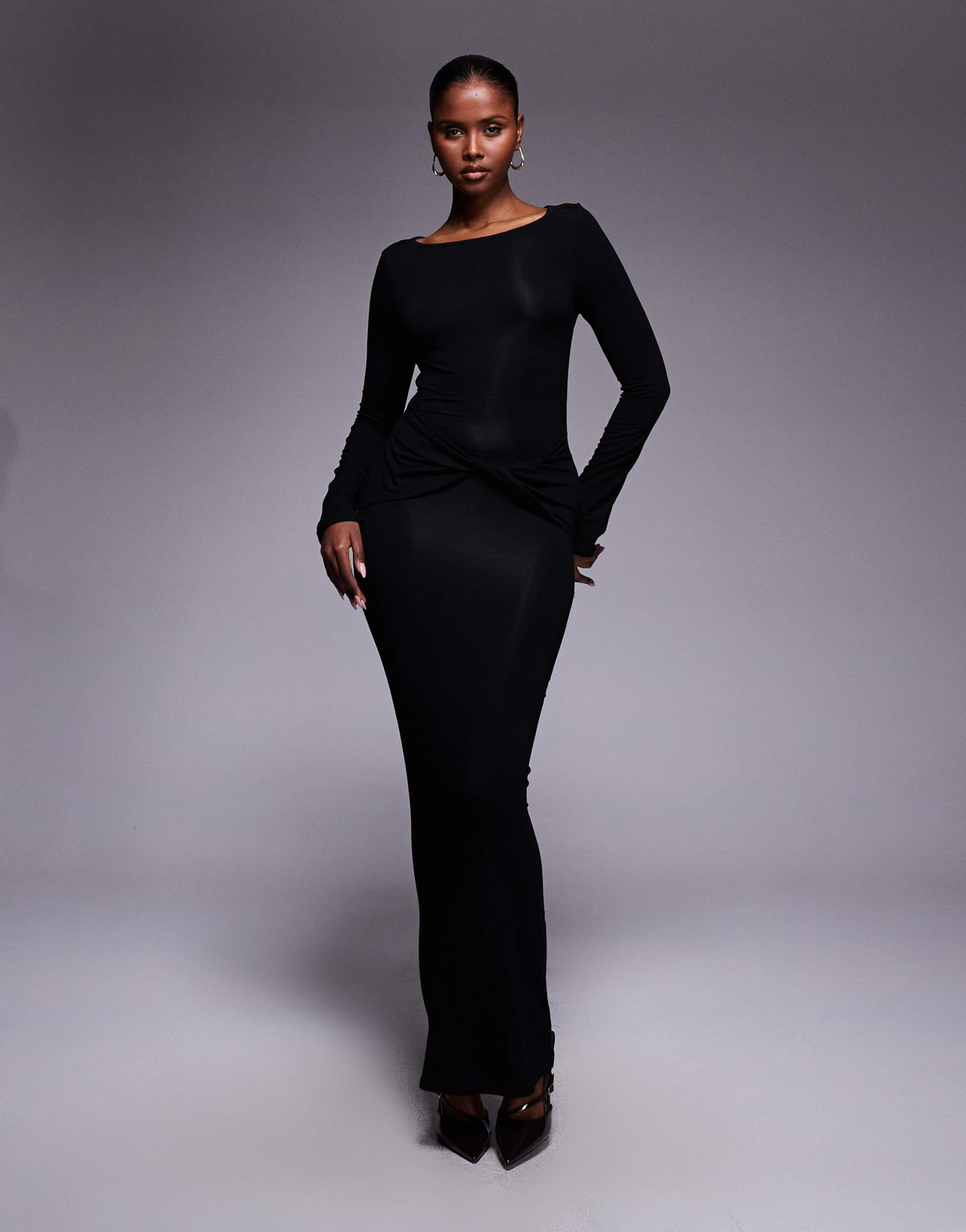 A sleek matte black maxi dress crafted from soft, stretchy viscose blend jersey features a flattering slim fit and elegant boat neckline. Long sleeves complement the sophisticated silhouette, while the standout twist detail and cut-out back add modern allure. The clean hemline and minimalist style make it versatile for cocktail parties, date nights, or chic evening events, blending comfort with refined elegance.