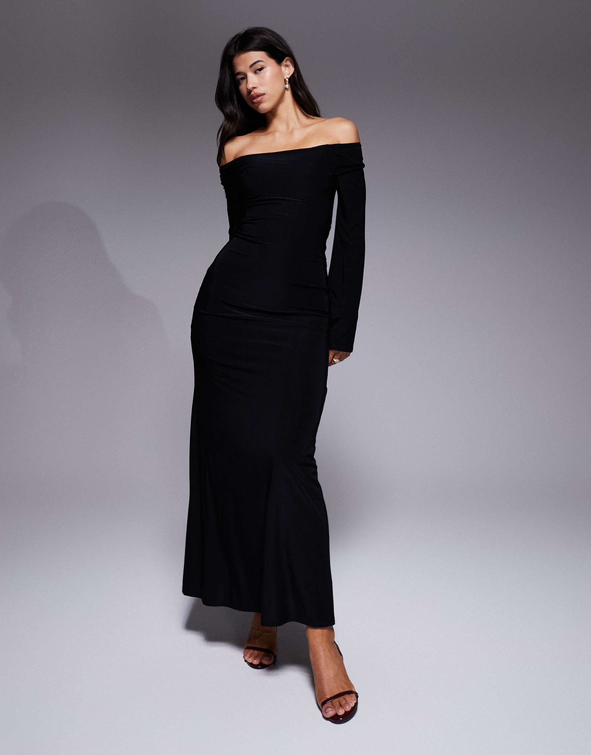 Glossy, stretchy jersey fabric shapes a slim-fitting column silhouette that flows elegantly to a clean maxi hem. The off-shoulder neckline with a twisted strap detail adds a sophisticated, sexy touch, while long sleeves provide balanced coverage. A lace-up tie-back enhances the modern design and ensures a flattering fit. Ideal for cocktail events, date nights, and evening outings, this matte black maxi dress blends sleek style with comfort and versatility.