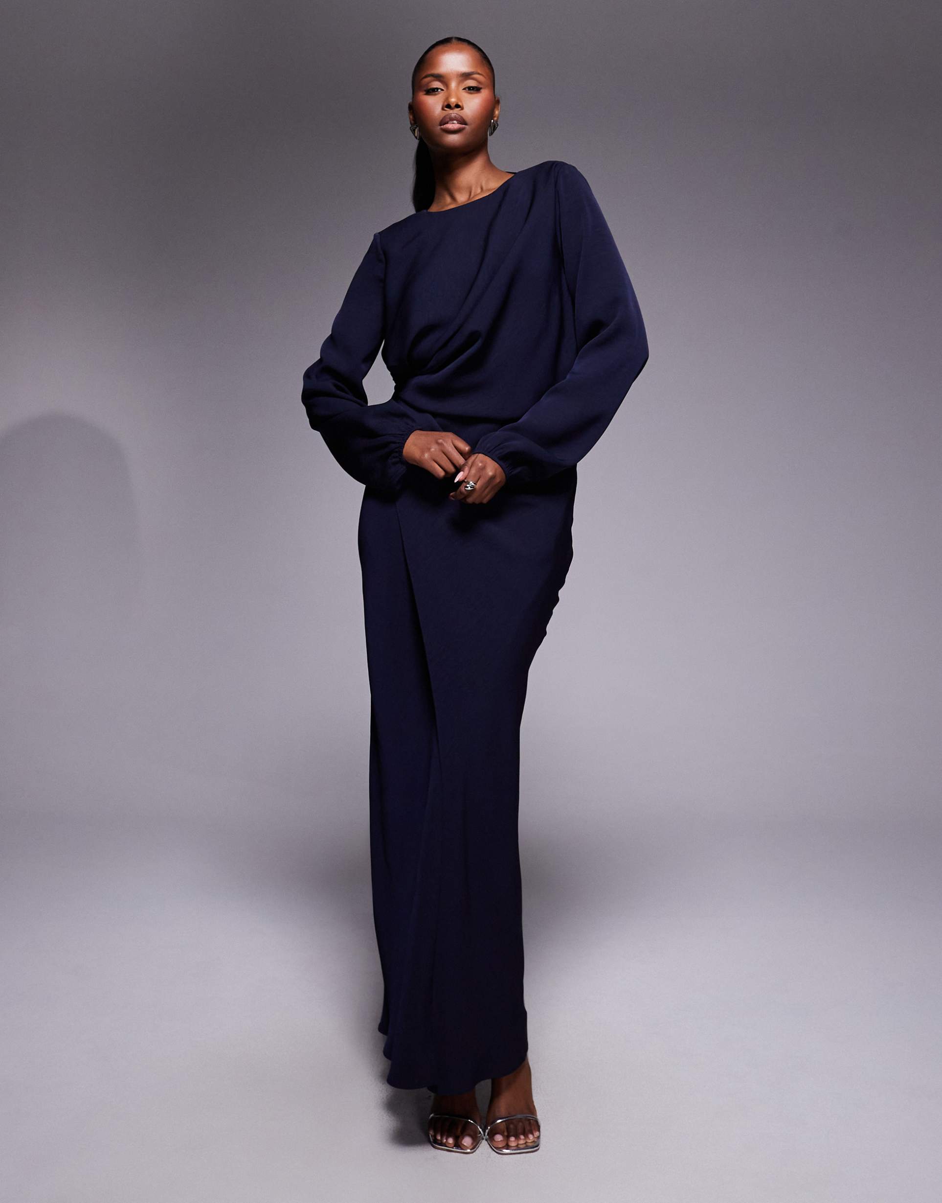 ASOS DESIGN LONG SLEEVE TWISTED WAIST DETAIL MAXI DRESS WITH OPEN BACK IN NAVY