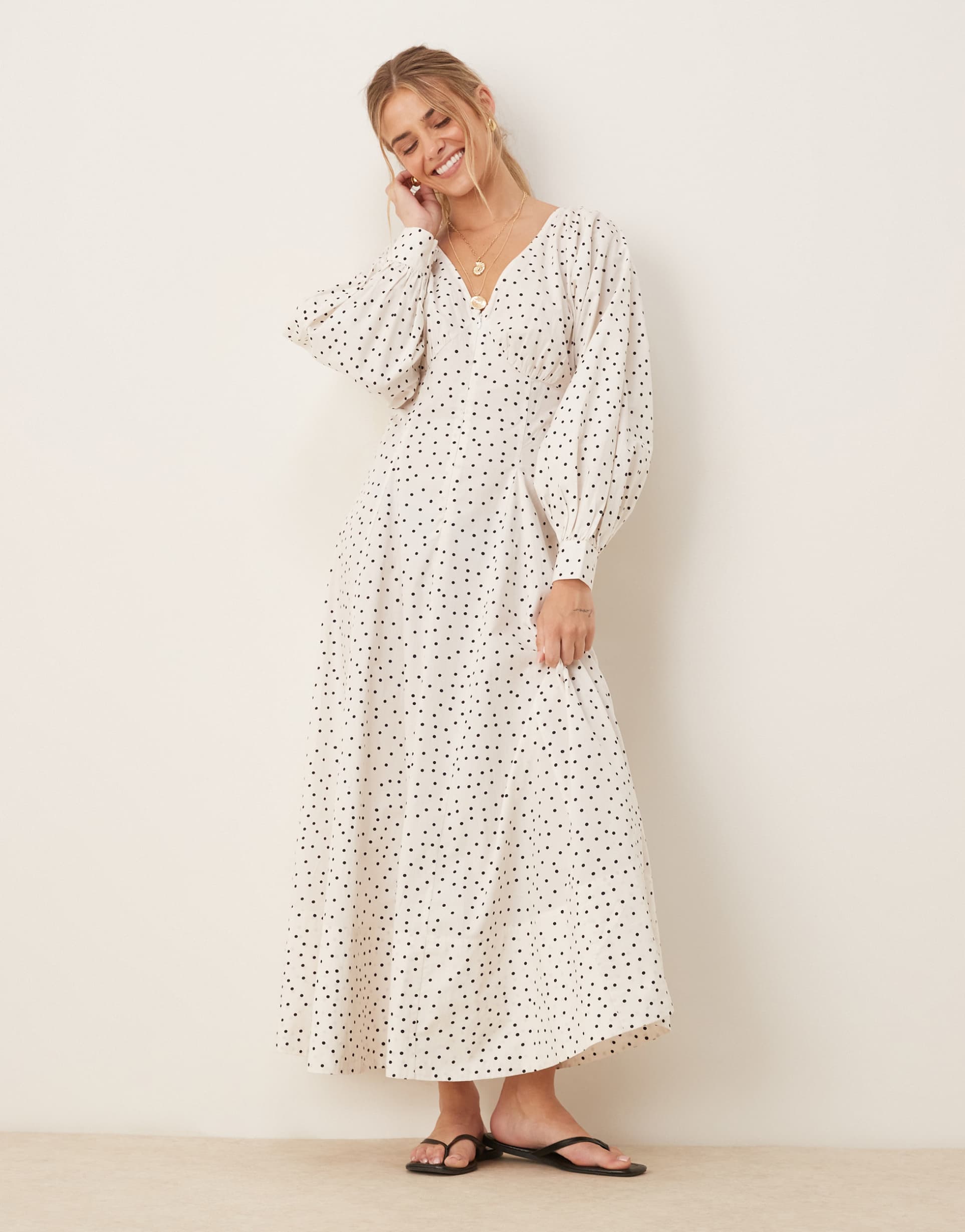 Soft cotton poplin with a fine weave brings a smooth sheen to this classic A-line maxi dress. The deep V-neckline and long regular sleeves balance elegance with everyday comfort, while the black polka dot pattern scattered all over the off-white base adds timeless charm. A front zipper closure enhances wearability. Its regular fit and flowing maxi length make it versatile for casual outings, brunch dates, or even workwear occasions during spring through autumn.