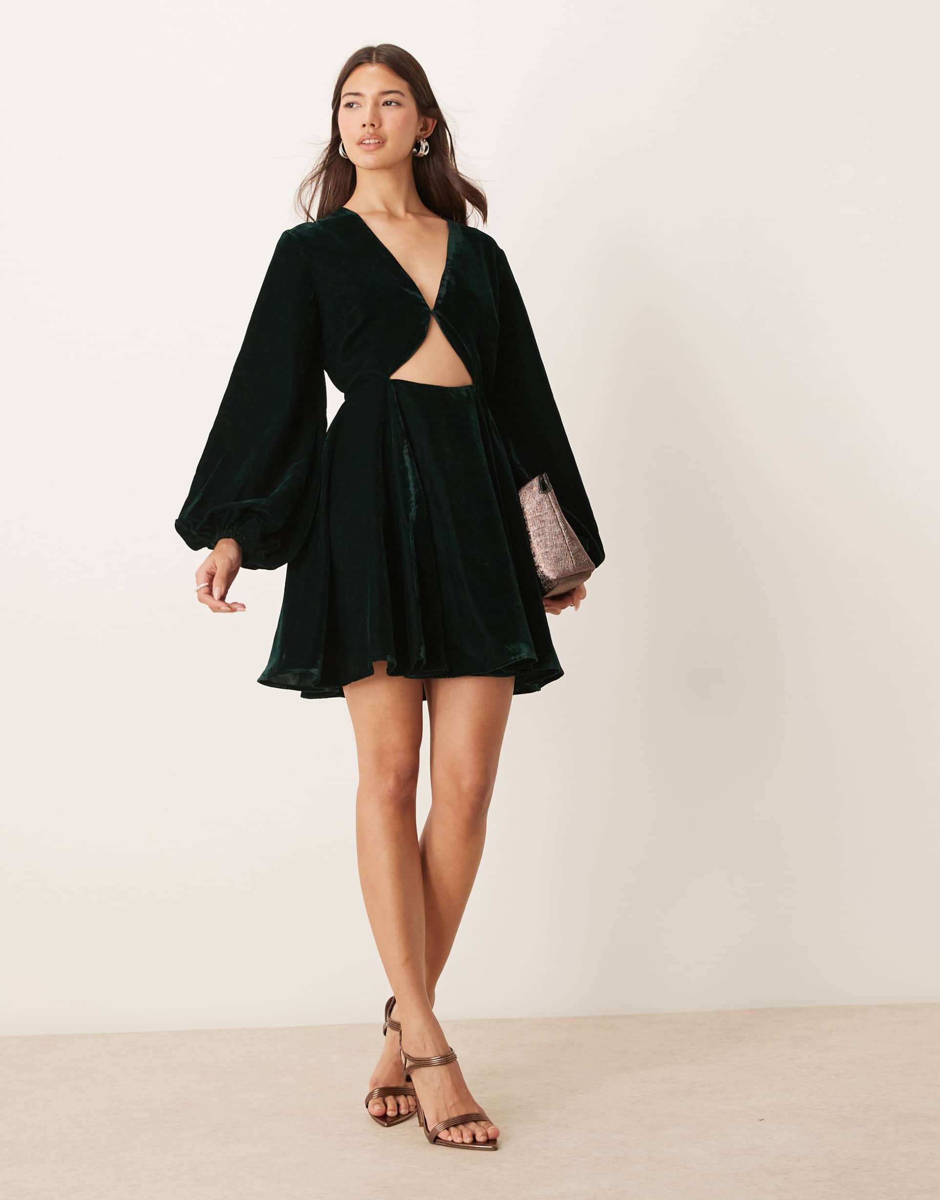 ASOS DESIGN LONG SLEEVE VELVET CUT OUT MINI DRESS IN DARK GREEN