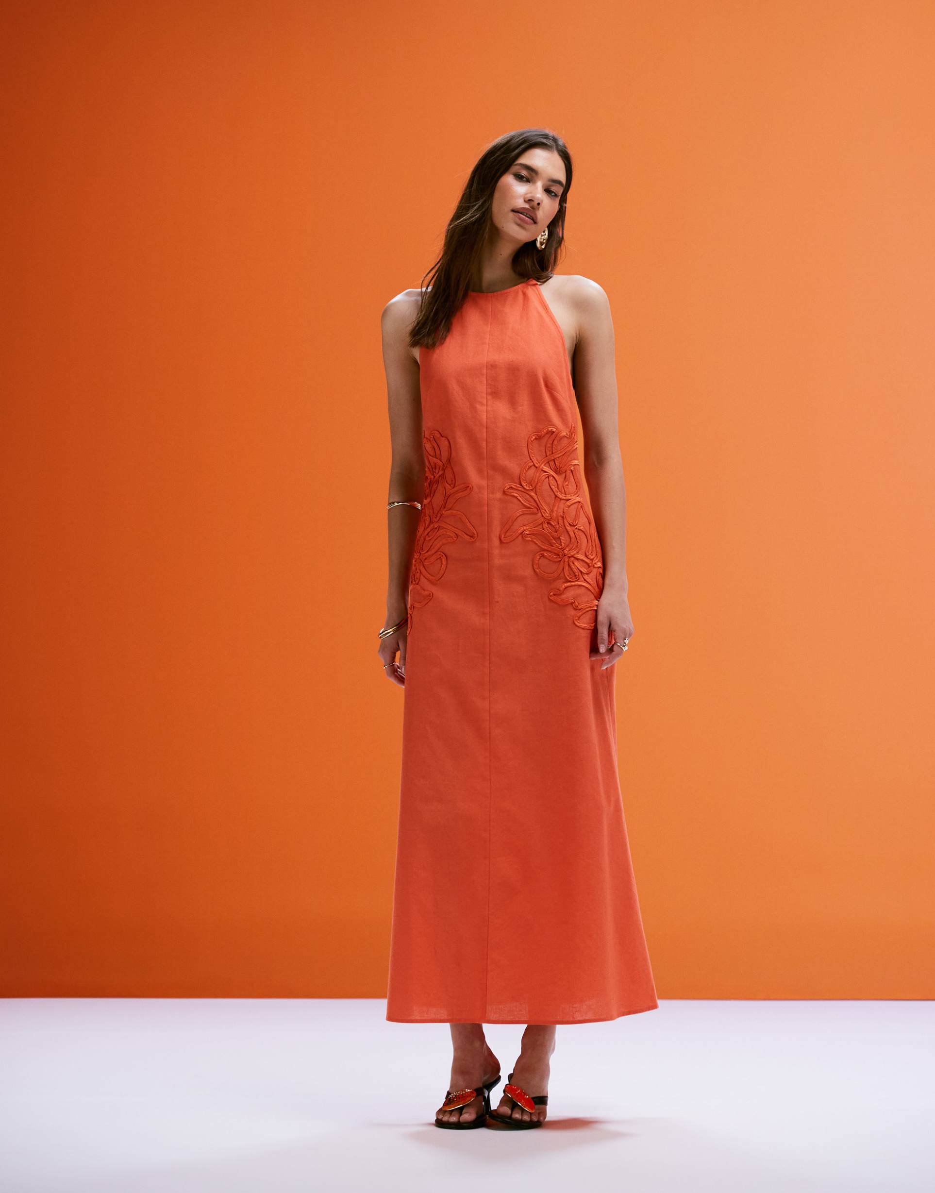 Soft matte orange polyester fabric and a sleek column silhouette create an elegant halter neck midi dress. The sleeveless design and low open back with adjustable tie straps add a modern touch, while intricate waist embroidery enhances the waistline with subtle detailing. This regular fit dress flows with a clean hemline, making it perfect for spring and summer occasions such as cocktail parties, date nights, or wedding guest attire. Its classic and contemporary style blends sophistication with effortless charm for versatile wear.
