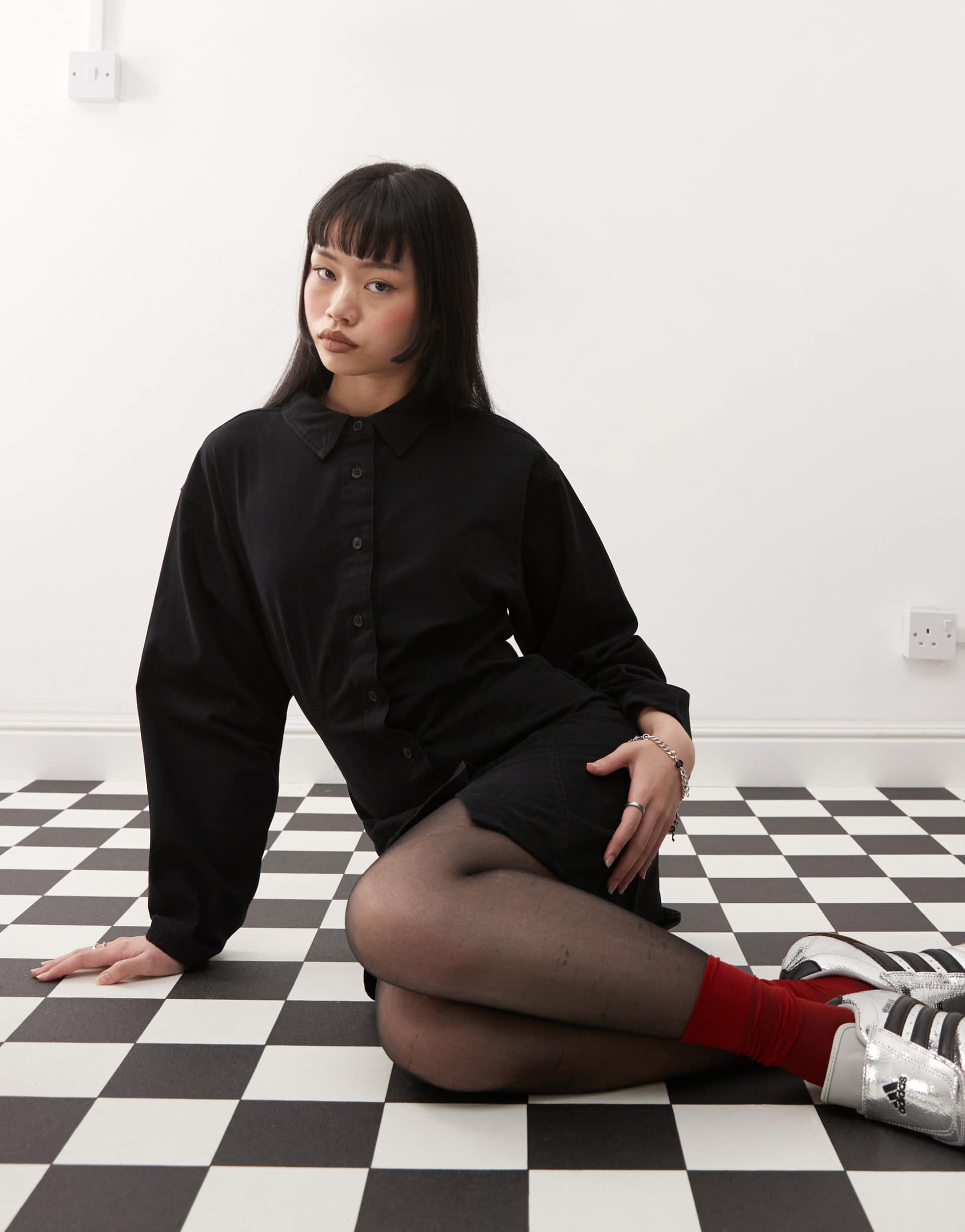 COLLUSION TWILL MINI SHIRT DRESS WITH SCULPTED SLEEVE IN BLACK