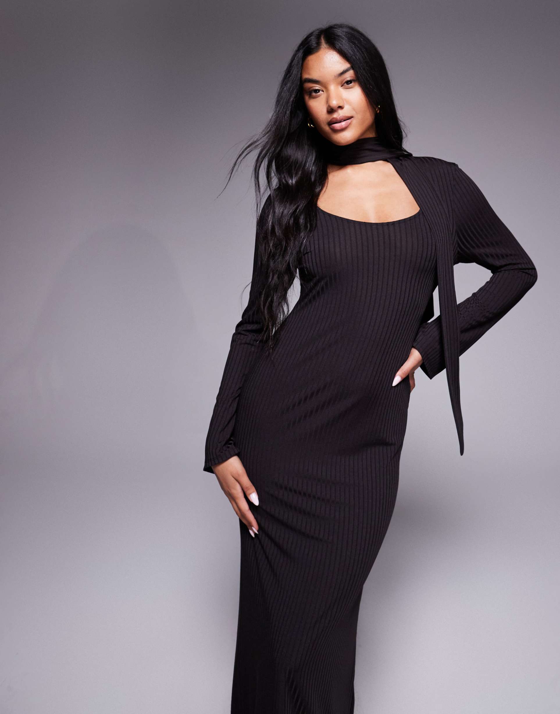 Matte dark brown ribbed jersey creates a sleek, slim-fit column silhouette that flows elegantly to the floor with a clean hemline. The long sleeves and low scoop neck enhance the minimalist yet sexy style, while the unique scarf detail adds a modern twist. Crafted from soft, stretchy polyester knit, this maxi dress is ideal for autumn and winter evenings. Perfect for date nights, cocktail parties, or nights out, it combines comfort with sophisticated style for versatile wear across various occasions.