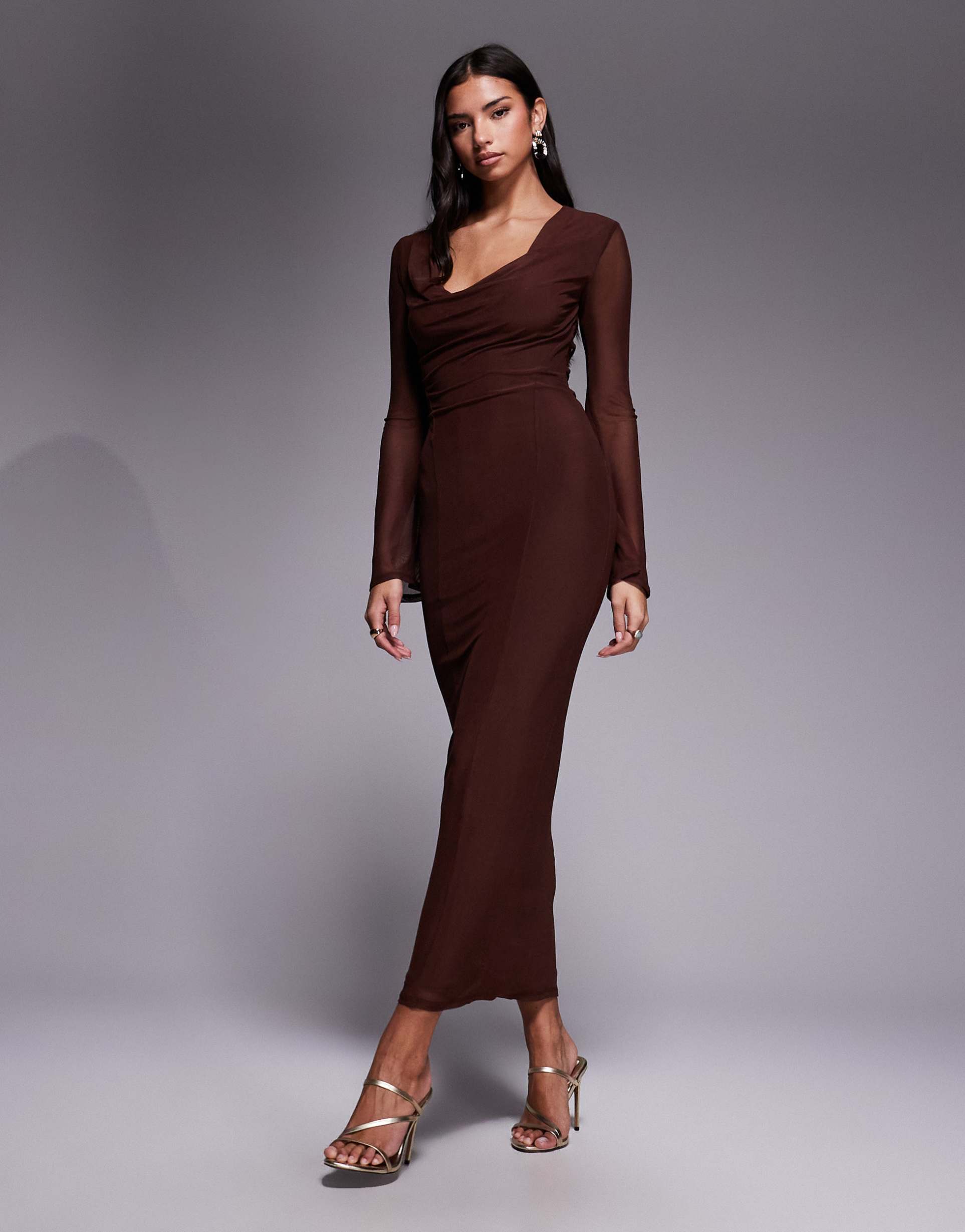ASOS DESIGN MESH ANGEL SLEEVE LACE UP BACK LONG SLEEVE MAXI DRESS IN CHOCOLATE