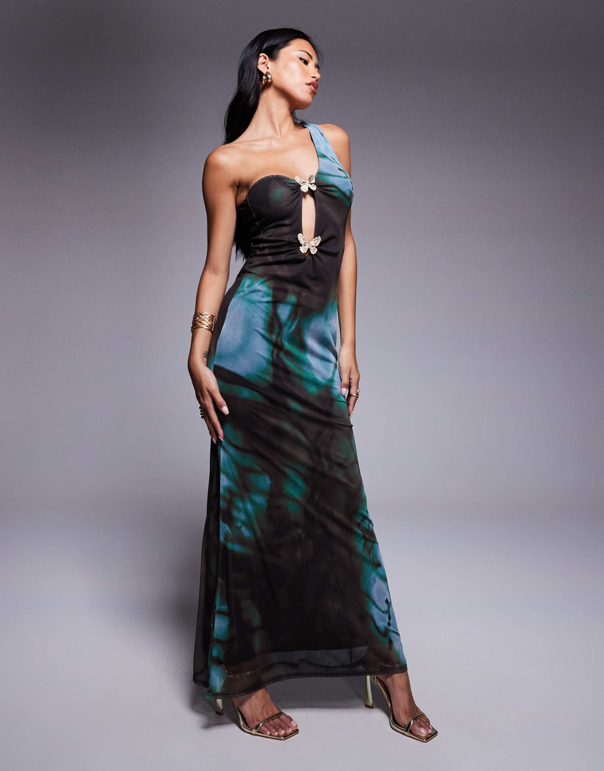 ASOS DESIGN MESH ASYMMETRIC ONE-SHOULDER MIDI DRESS WITH BUTTERFLY TRIMS IN ABSTRACT PRINT