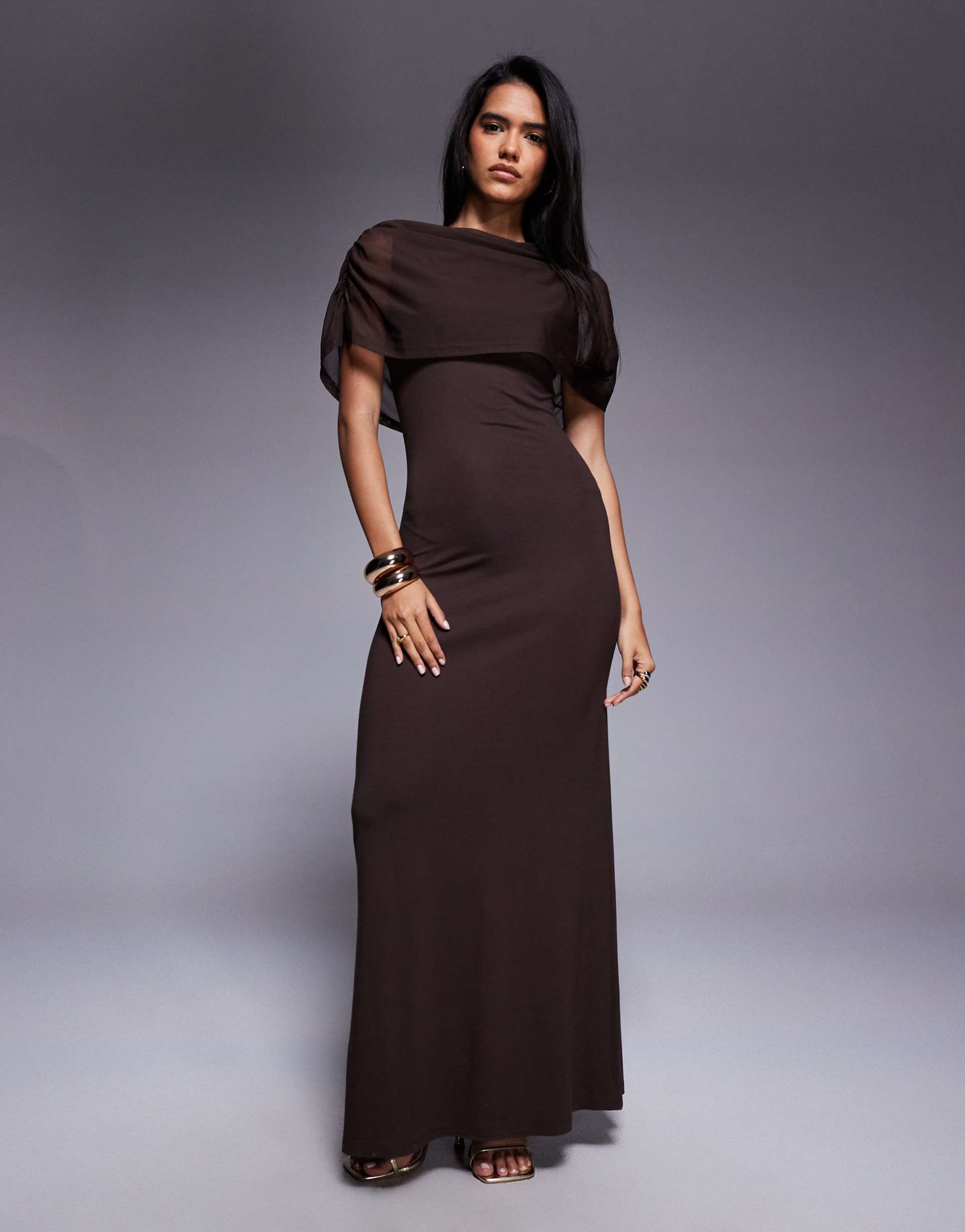 ASOS DESIGN MESH CAPE MAXI DRESS IN CHOCOLATE BROWN