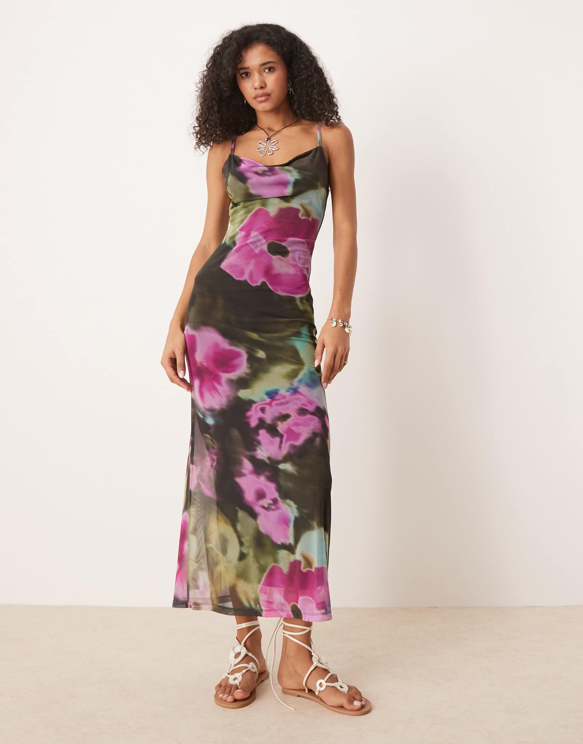 ASOS DESIGN MESH COWL FLORAL PRINTED MIDI DRESS