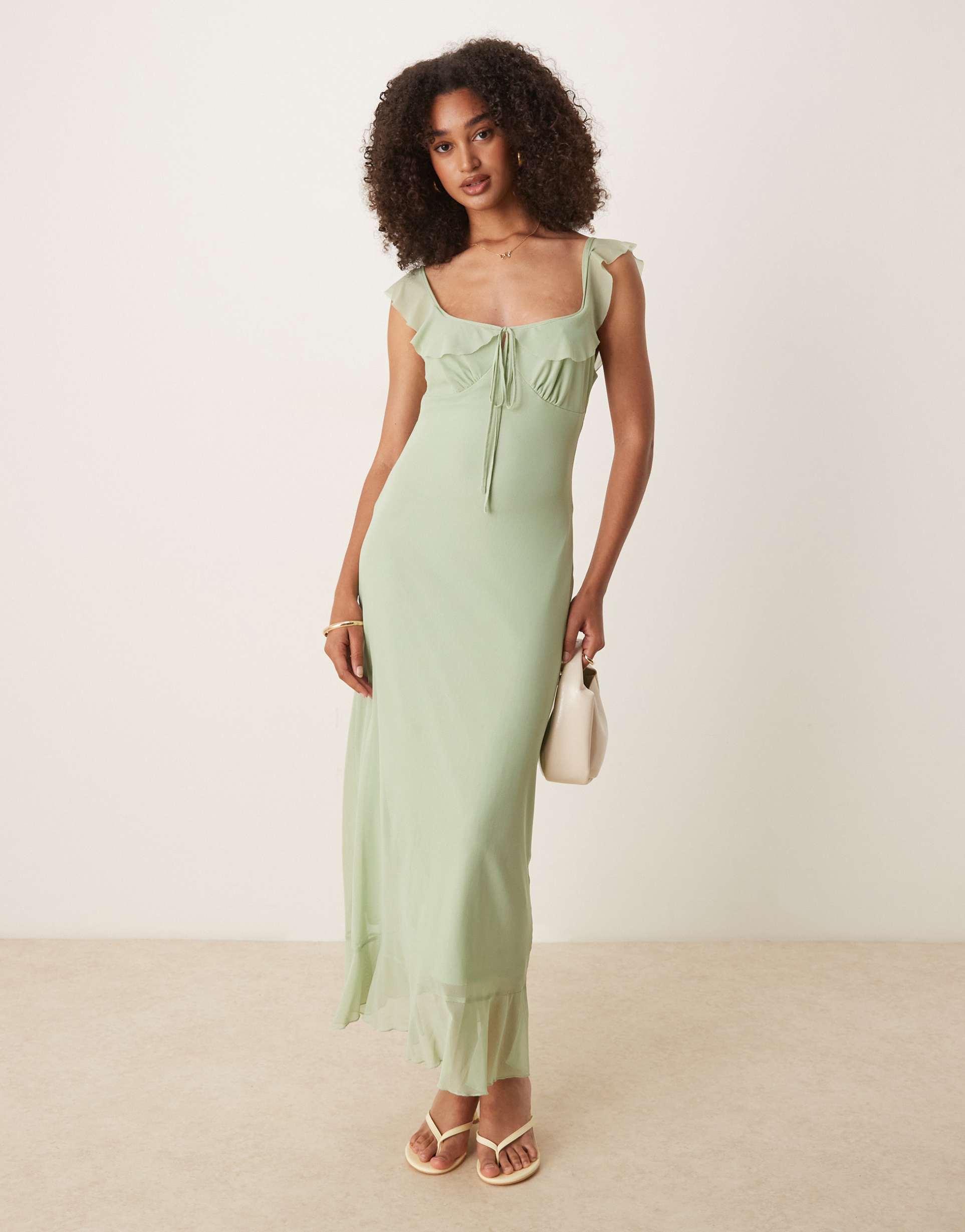 ASOS DESIGN MESH DOUBLE FRILL MIDI TEA DRESS IN SAGE