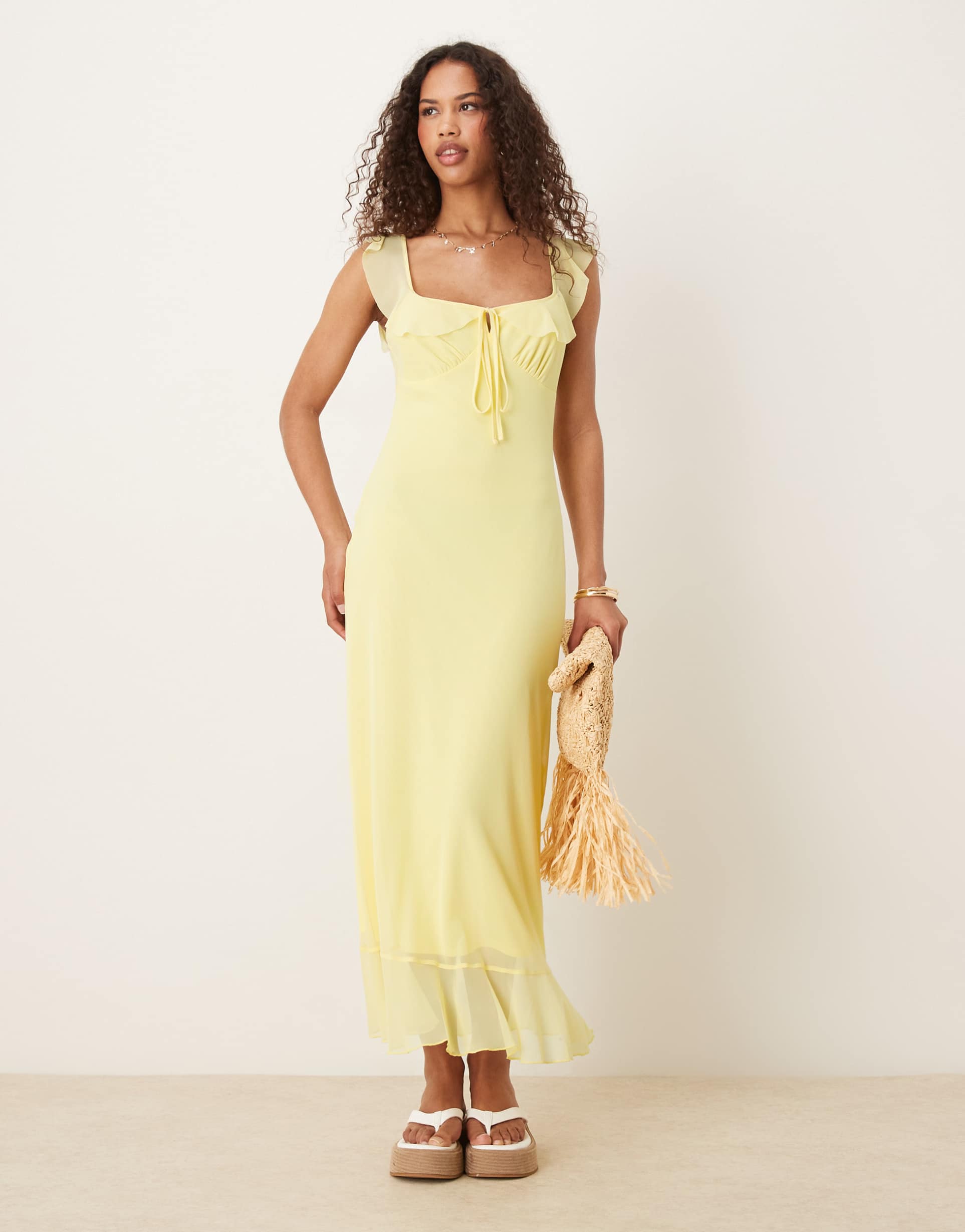 ASOS DESIGN MESH DOUBLE FRILL MIDI TEA DRESS IN YELLOW