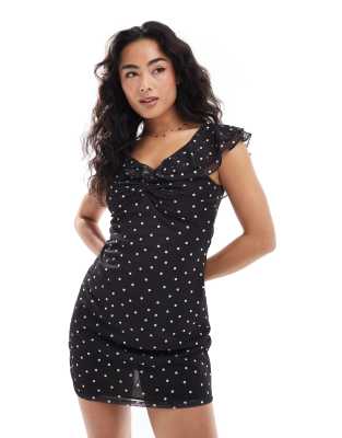 ASOS DESIGN MESH FRILL SHOULDER MINI DRESS IN MONO POLKA DOT