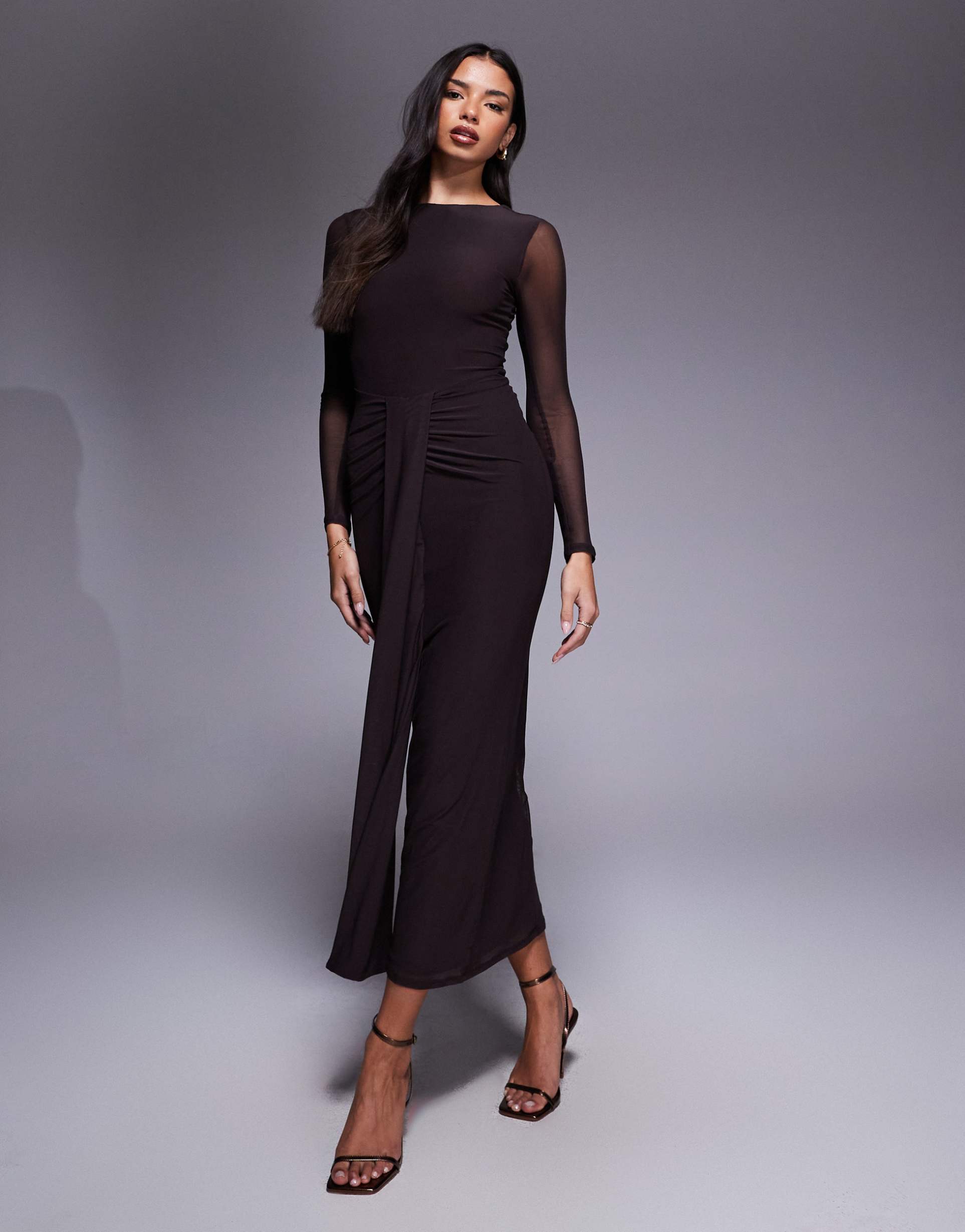 ASOS DESIGN MESH LONG SLEEVE SLASH NECK OPEN BACK MAXI DRESS WITH SASH IN CHOCOLATE