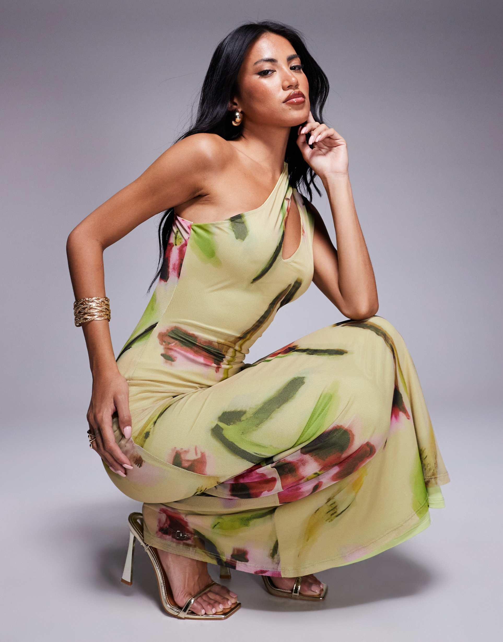 Soft mesh fabric with a fine, sheer texture highlights this modern slip dress featuring a flattering asymmetric neckline and one-shoulder strap. The regular fit skims the body gently, while a bold front cut-out adds edgy appeal. Floral prints in muted green and pink tones bloom across a matte light yellow base, complemented by a clean midi hemline. Ideal for spring and summer events, this versatile piece transitions seamlessly from brunch to cocktail parties and date nights, combining comfort and trendy style with a subtle sexy vibe.