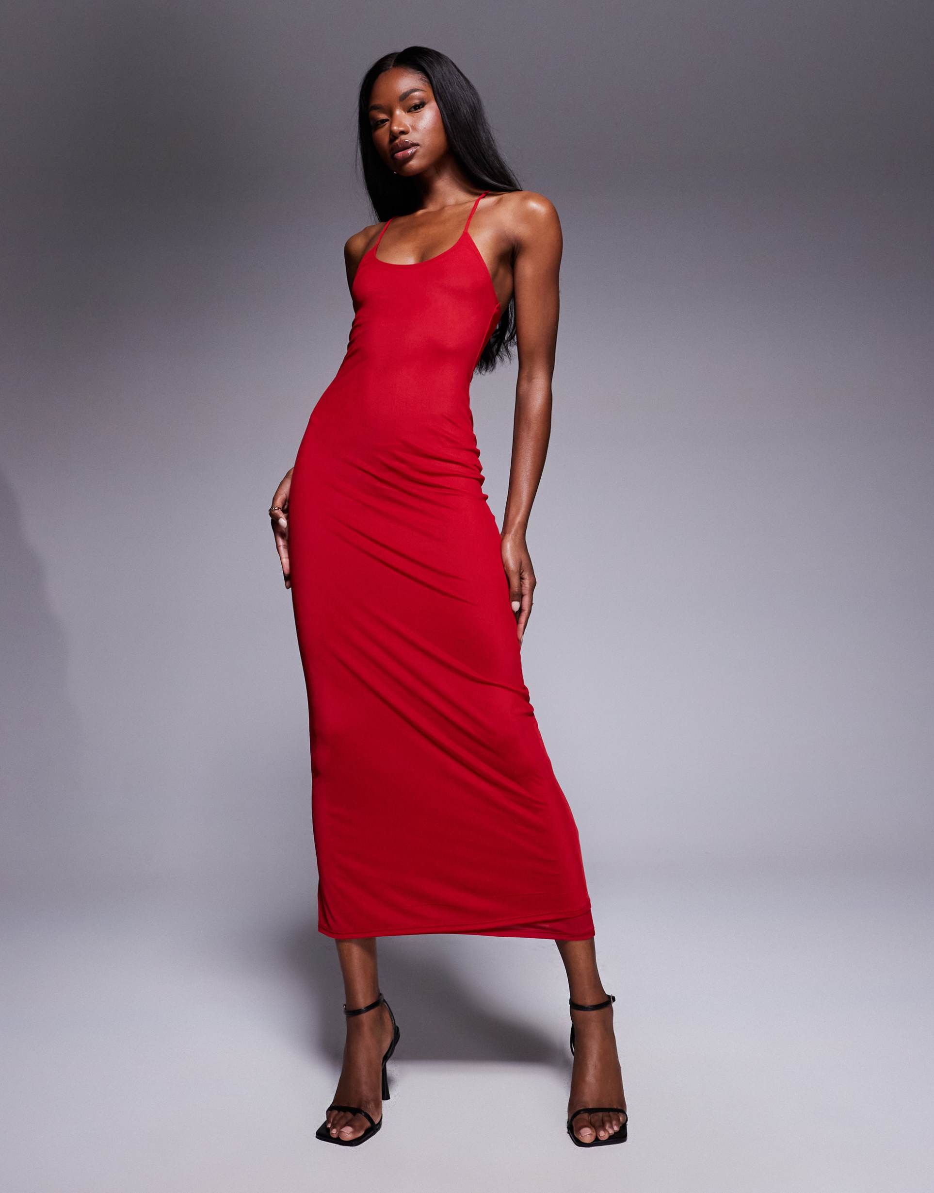 ASOS DESIGN MESH SUPER SCOOP CAMI MIDI DRESS IN RED