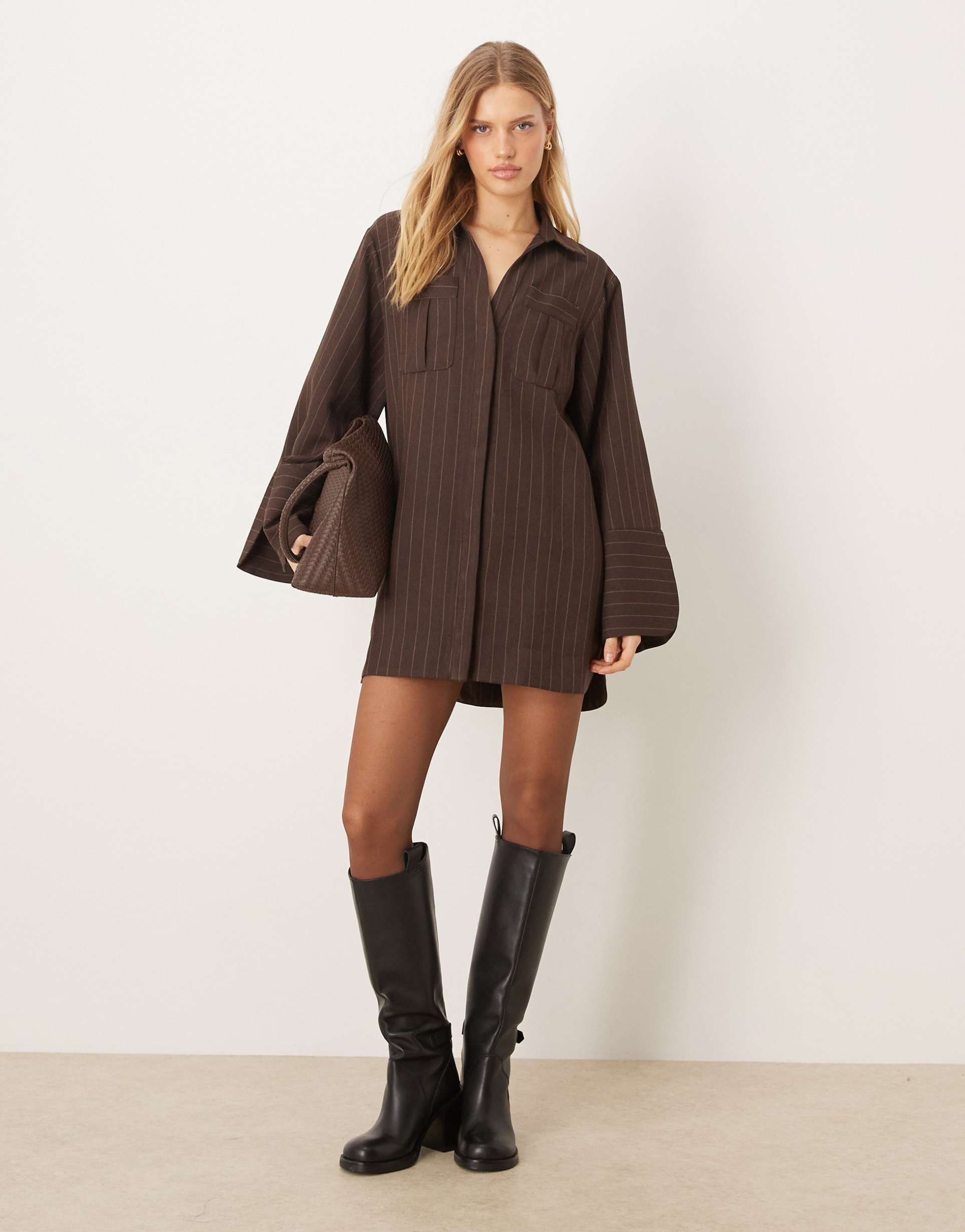 ASOS DESIGN MINI SHIRT DRESS WITH WIDE CUFFS AND OVERSIZED POCKETS IN BROWN STRIPE