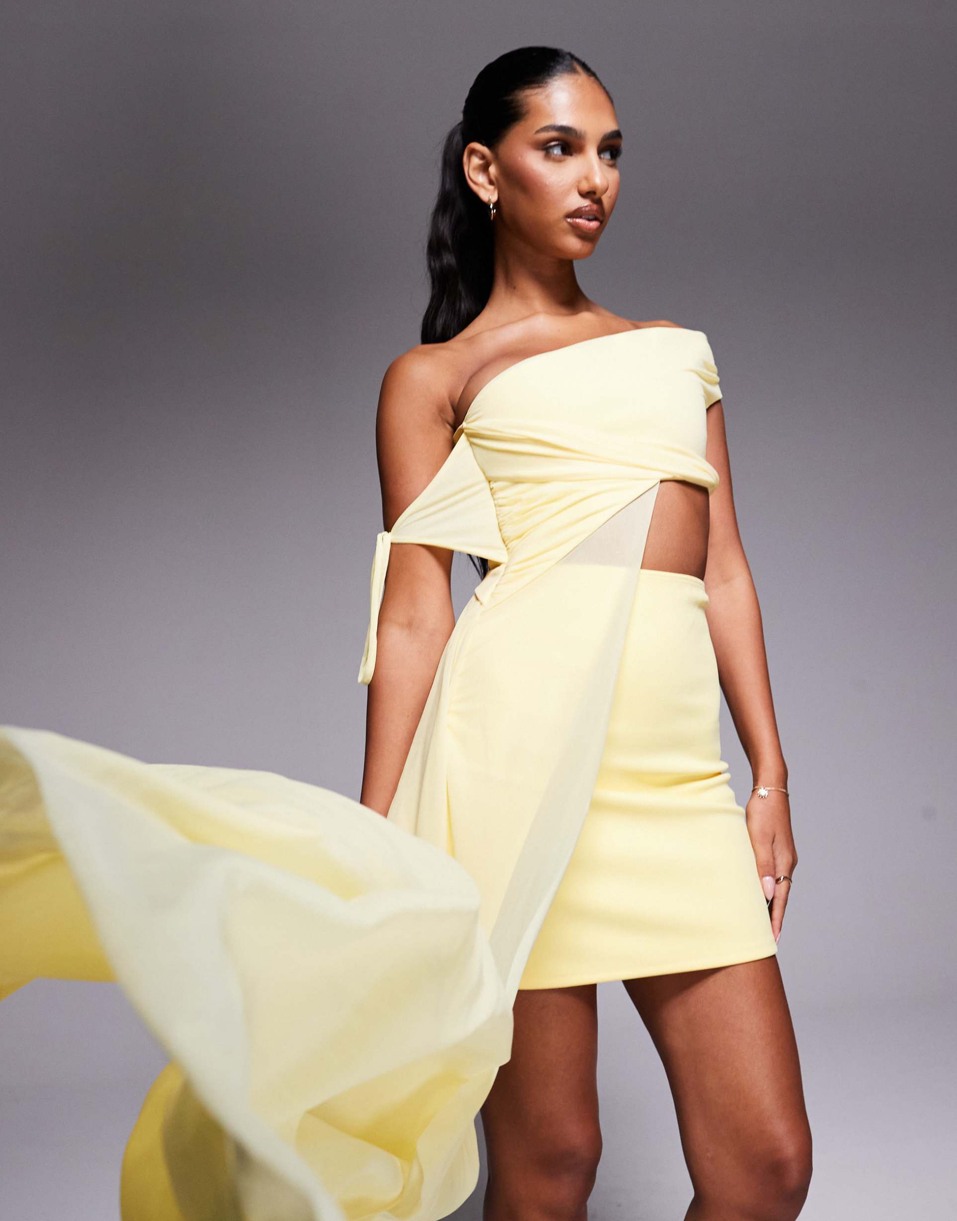 ASOS DESIGN OFF-SHOULDER CUT-OUT MINI DRESS WITH MESH DRAPE IN YELLOW