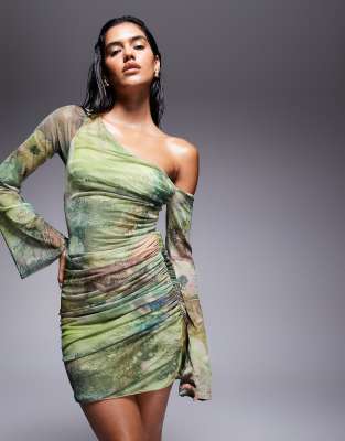 An asymmetric neckline and flared ruffle sleeves bring playful elegance to this slim fit mini dress in a sheer mesh fabric. The abstract all-over print in muted green, brown, and beige tones enhances its modern vibe, while ruched sides add flattering texture and shape. Perfect for night outs, date nights, or casual events, this polyester-spandex blend offers both stretch and comfort. The clean hemline and covered back complete a trendy silhouette that balances daring style with wearable ease across seasons.