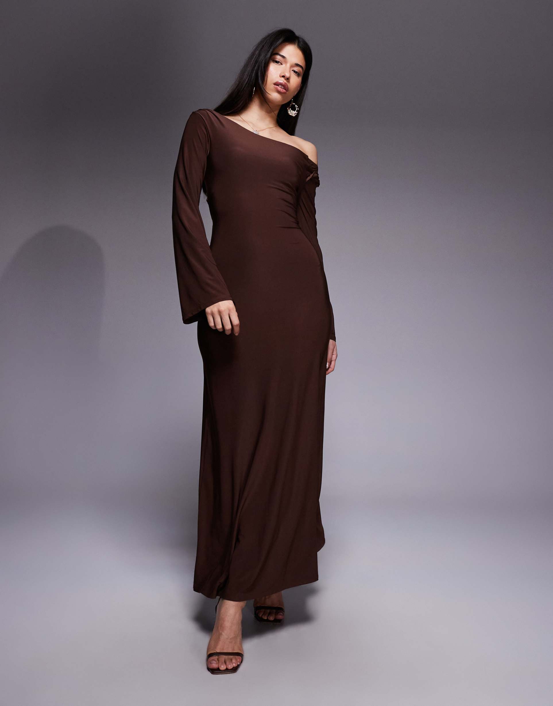 ASOS DESIGN OFF SHOULDER SCULPTING MAXI DRESS IN CHOCOLATE