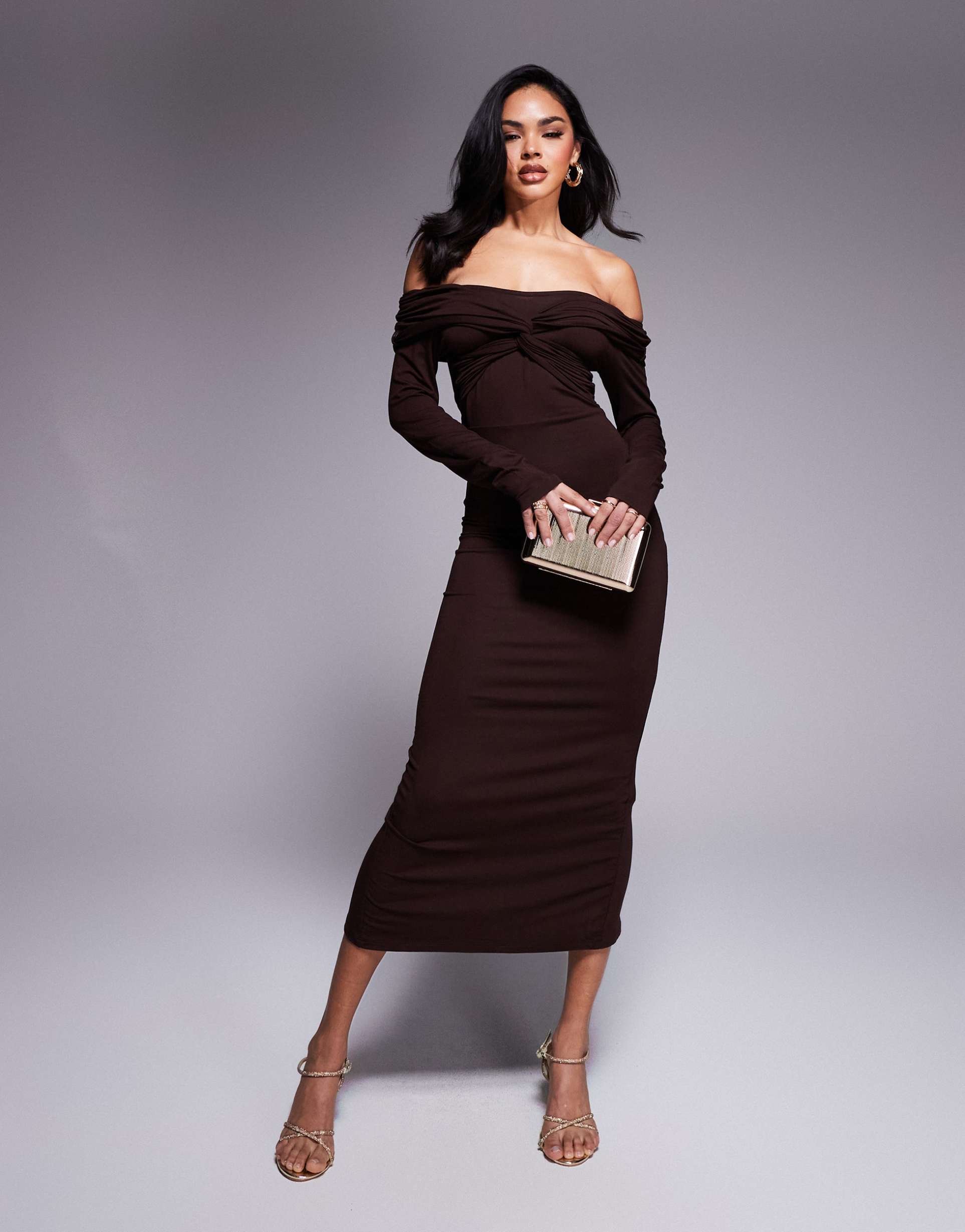 ASOS DESIGN OFF SHOULDER TWIST MIDI DRESS WITH LONG SLEEVES IN CHOCOLATE