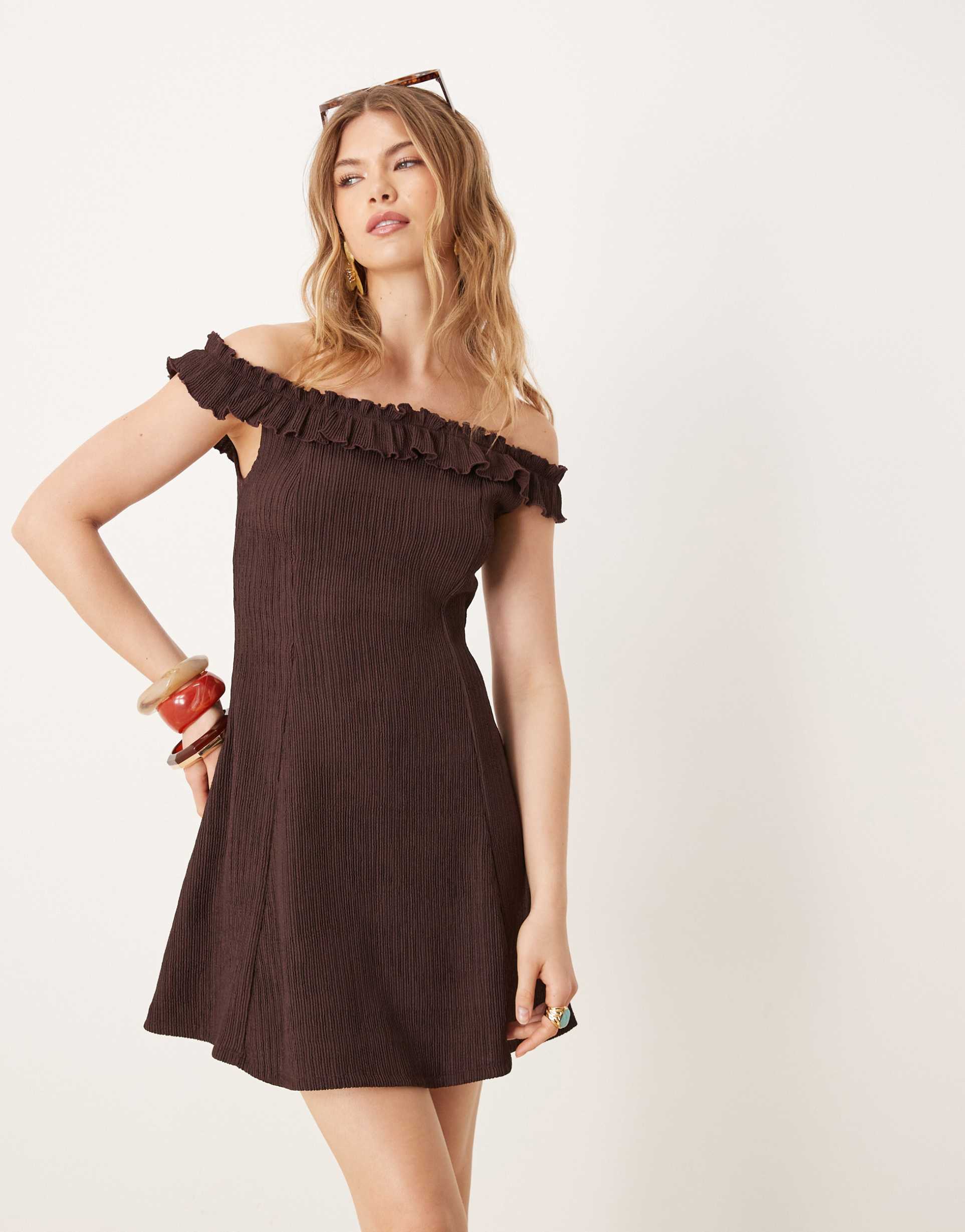 ASOS DESIGN OFF THE SHOULDER FRILL MINI DRESS IN PLUM