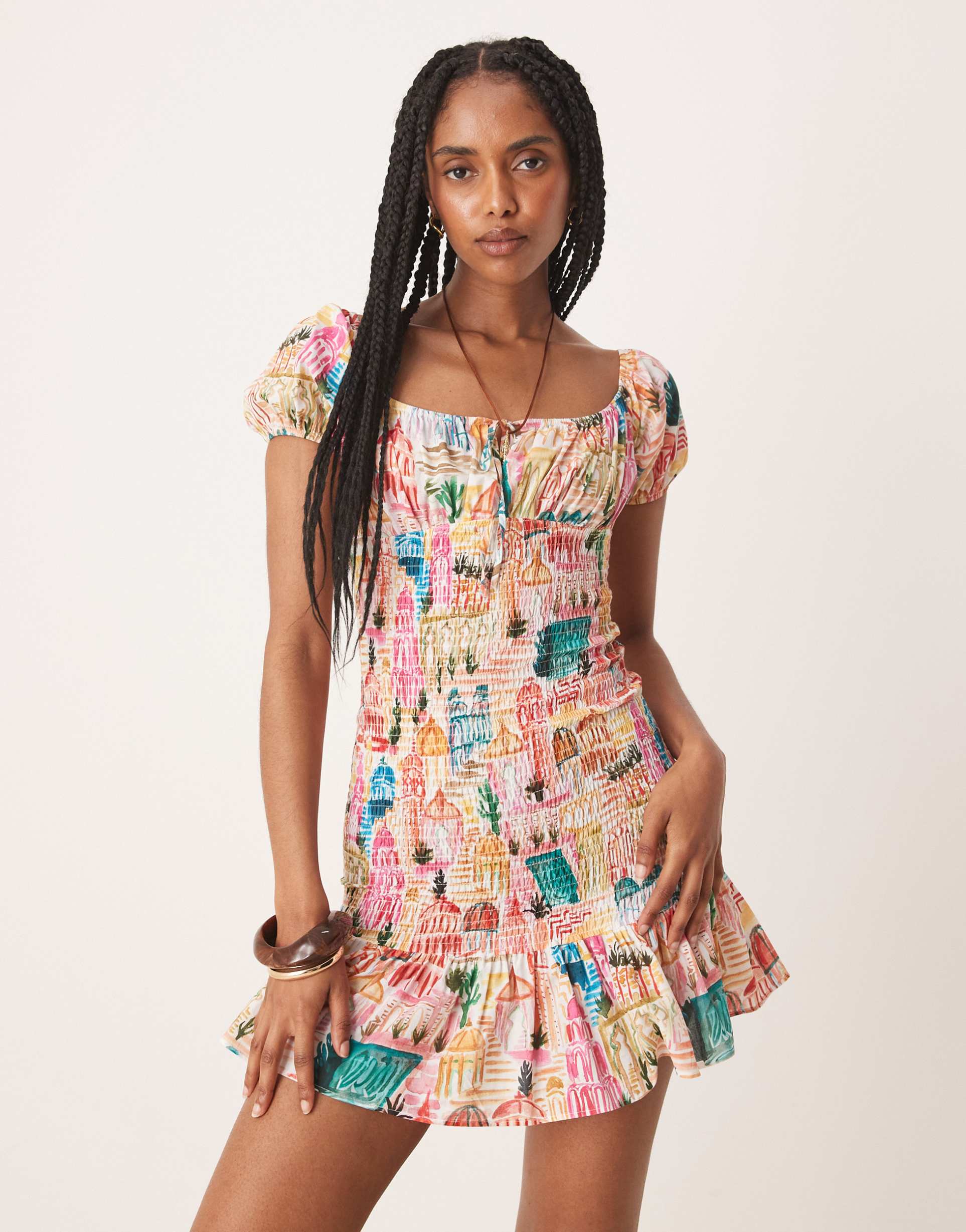 ASOS DESIGN OFF THE SHOULDER TIE FRONT SHIRRED MINI DRESS IN FLORAL PRINT