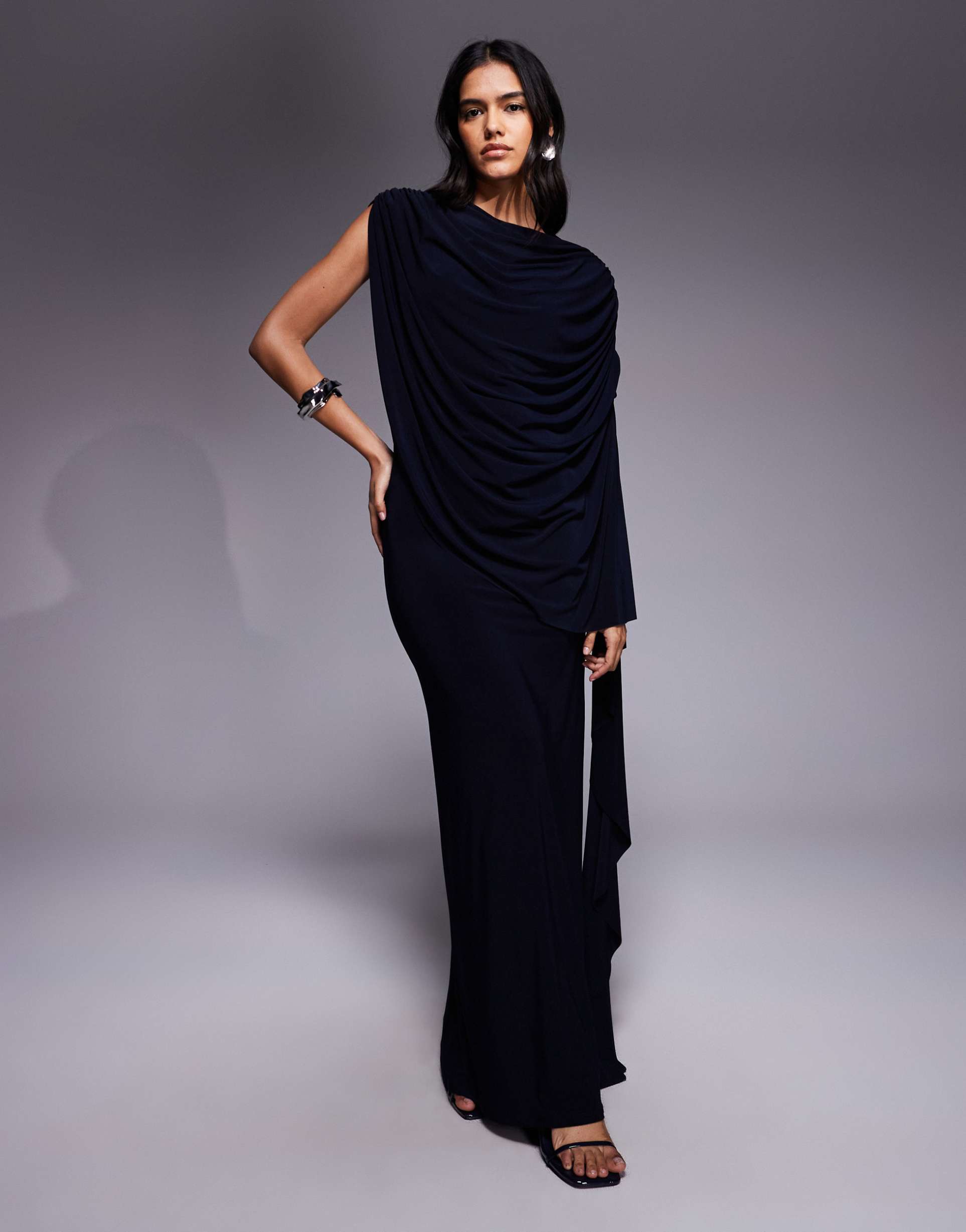 ASOS DESIGN ONE SHOULDER CAPE MAXI DRESS IN NAVY