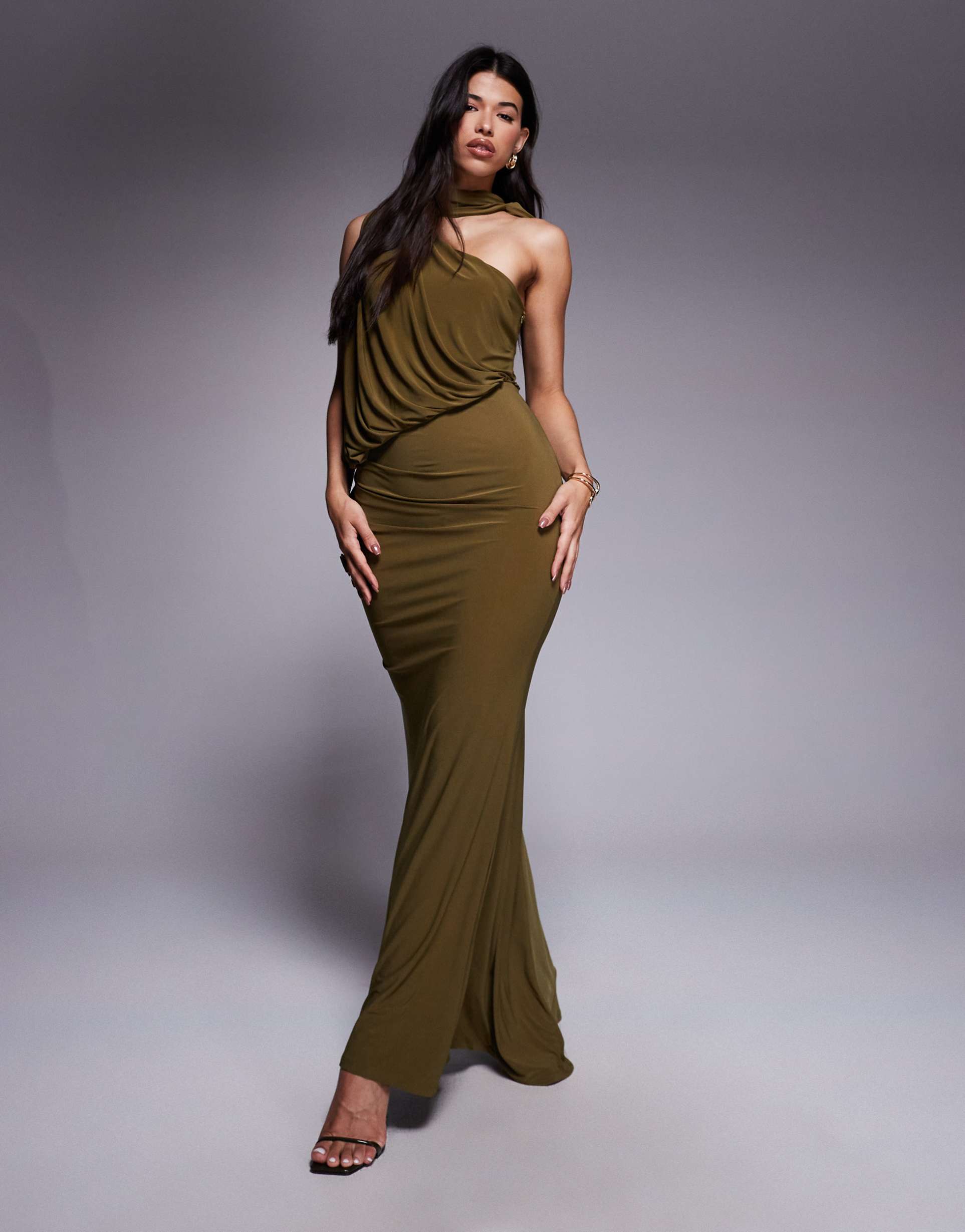 Soft jersey fabric with a matte khaki hue sculpts a slim, column silhouette that flows into a clean maxi hem. The high neck merges seamlessly with a striking one-shoulder strapless design, while elegant draping detail at the front adds refined texture and sophistication. This versatile maxi dress suits cocktail parties, date nights, and formal events with its polished, figure-flattering fit and timeless style.